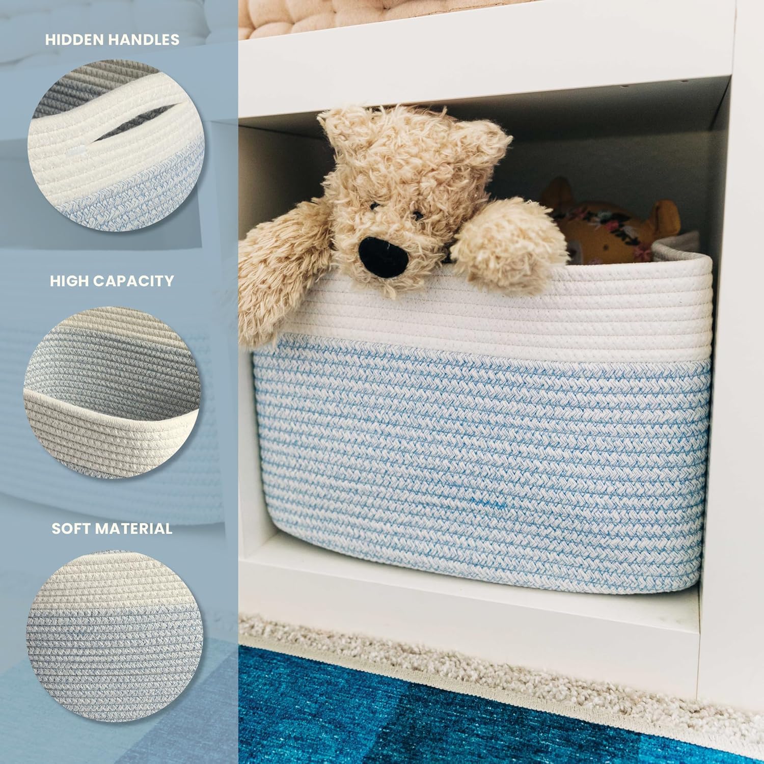 OrganiHaus Woven Storage Baskets for Organizing, Cotton Rope Organizer Bins for Shelves, Closet & Nursery, Dog Toy Basket, Decorative Bins for Toys, Towels & Books - 15x10x9, Blue/Off-White