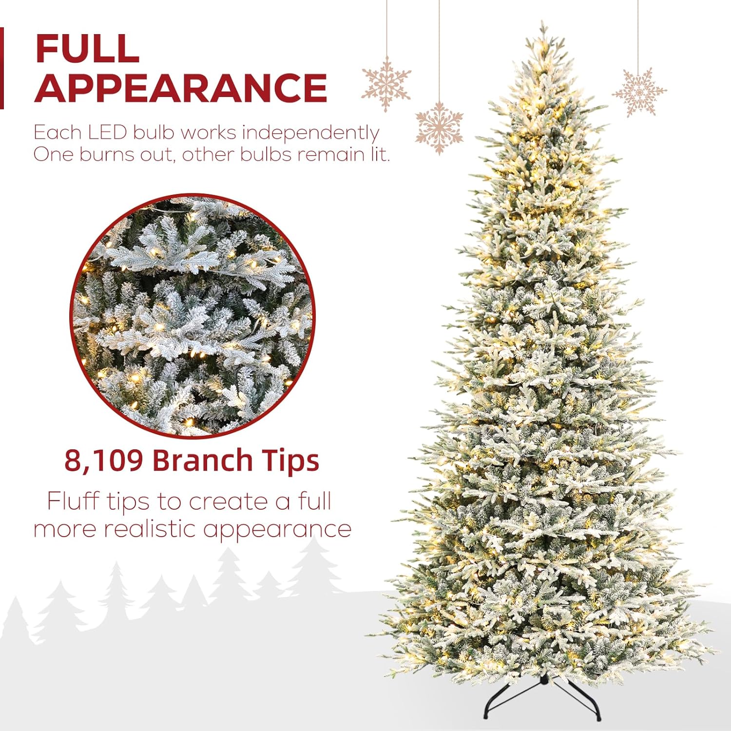 - NATURAL & Full LOOK: Measures 12 feet tall, 72 inches diameter at the base. Featuring snow sprinkled branch tips which creates a wintry feel, 8109 PE& PVC branch tips for a full and life-like look, this snow flocked Christmas tree can be easily fluffed and shaped for a splendid and natural display and also provides abundant space to showcase your favorite ornaments.