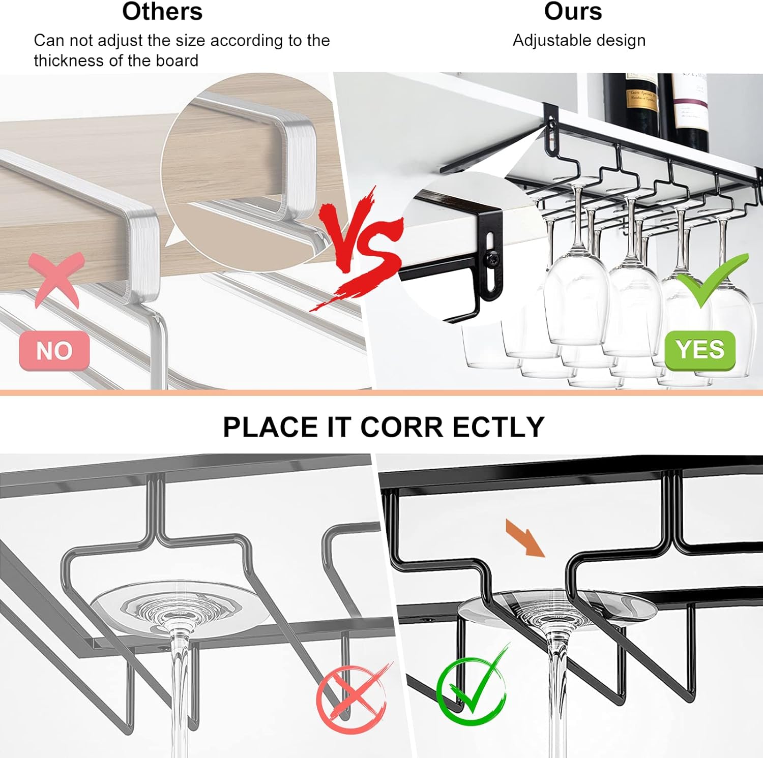 - 【Adiustable Wine Glass Rack】You can adjust the rack's mezzanine width to fit your cupboard, fit for 0.2-1.6in thickness(0.5-4CM). The perforation-free installation design makes the wine glass holder not only suitable for wooden partitions, but also for floating plates of different materials such as stone plates and glass partitions.