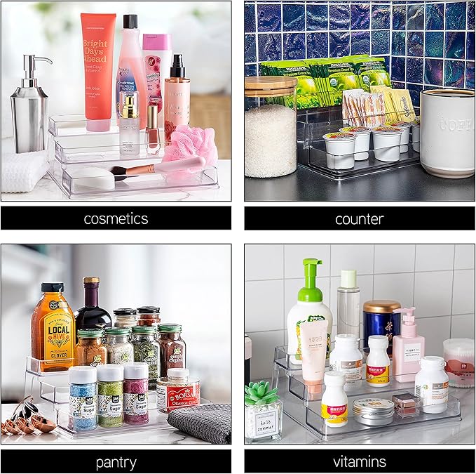 - SET INCLUDES: This rack has three tiers to increase visibility and easy access to the items on your kitchen counter or cabinets. Deep shelves helps to prevent spills from spreading. Dimensions are: 10.5" x 9.5" x 4.25"