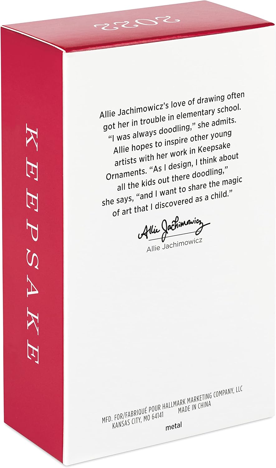 - Designed by Allie Jachimowicz, this Christmas tree ornament is packaged in a box for easy gift giving, preservation and storage.