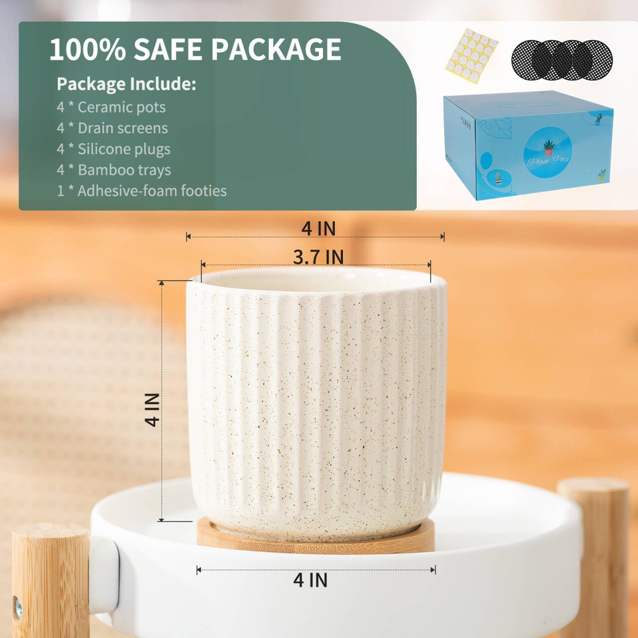 TAMAYKIM 4 Inch Ceramic Plant Pots with Drainage Holes, Modern Flower Planter with Saucer for Indoor Plants, Succulent, Cactus & Herbs, Beige, Set of 4 (Plants Not Included)