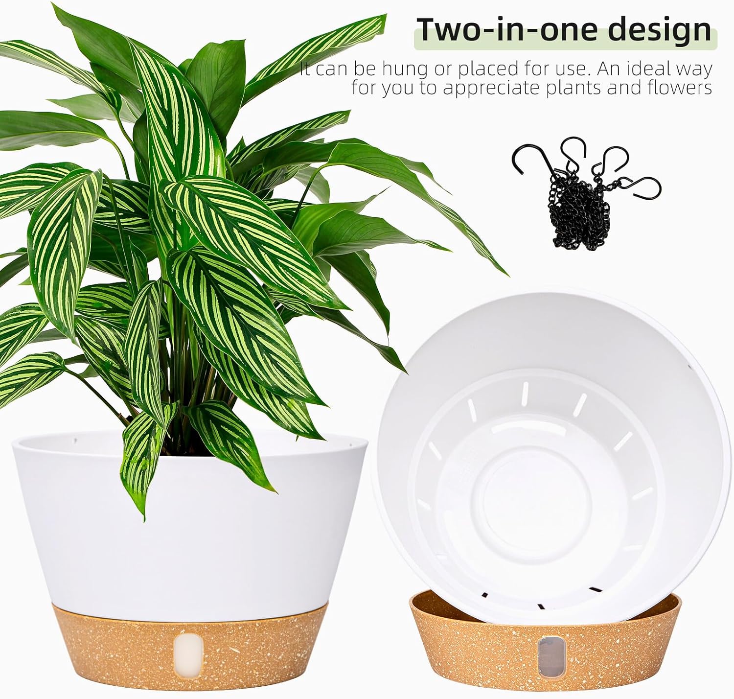 - SELF WATERING & VISIBLE WATER LEVEL: Self watering hanging pot is ingeniously designed, tightly connecting the tray and the pot body, turning the tray into a water reservoir with visible holes, allowing you to clearly see the water level (If you water too much, water will flow out from the edge of the tray to prevent the plants from being submerged)