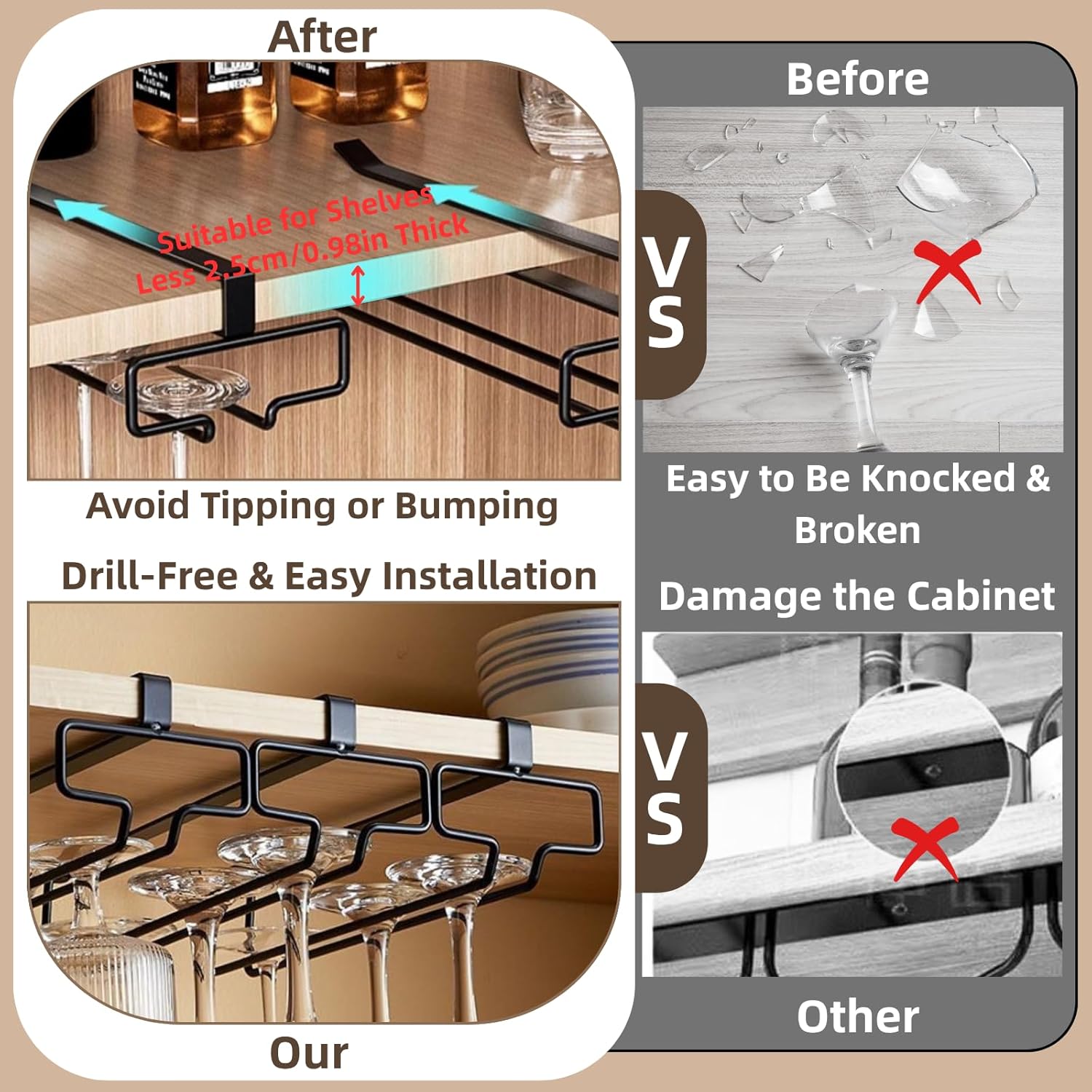 - Drill-Free & Easy to Install: No drilling is required. This wine glass rack can securely hold your wine glasses without worrying about accidental slippage or falling. The smooth black finish prevents any scratching or chipping on the surface of the wine glasses. It's very easy to clean and not easily stained.