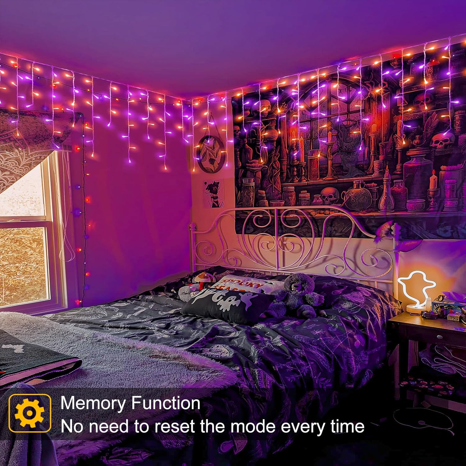 - Connectable Icicle Lights for Outside: 400 pieces LED bulbs 32.8ft light length, each Christmas lights has end-to-end connection that allows up to 3 light strings connected together to meet your different decor needs. 9.84ft lead wire meant no need an extension cord, perfect orange and purple halloween lights for outdoor decoration.