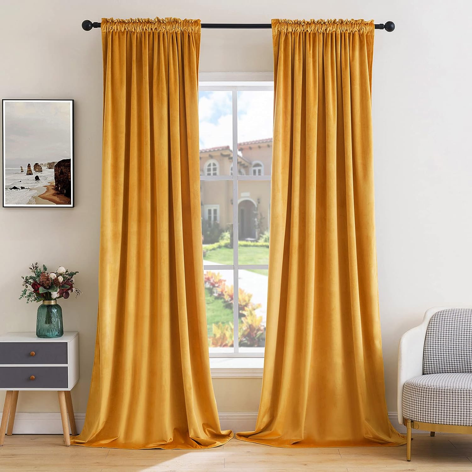 MIULEE Mustard Yellow Velvet Curtains Thermal Insulated Blackout Curtain Fall Drapes for Bedroom Living Room Darkening 96 Inches Long Curtains Panels Rod Pocket Set of 2