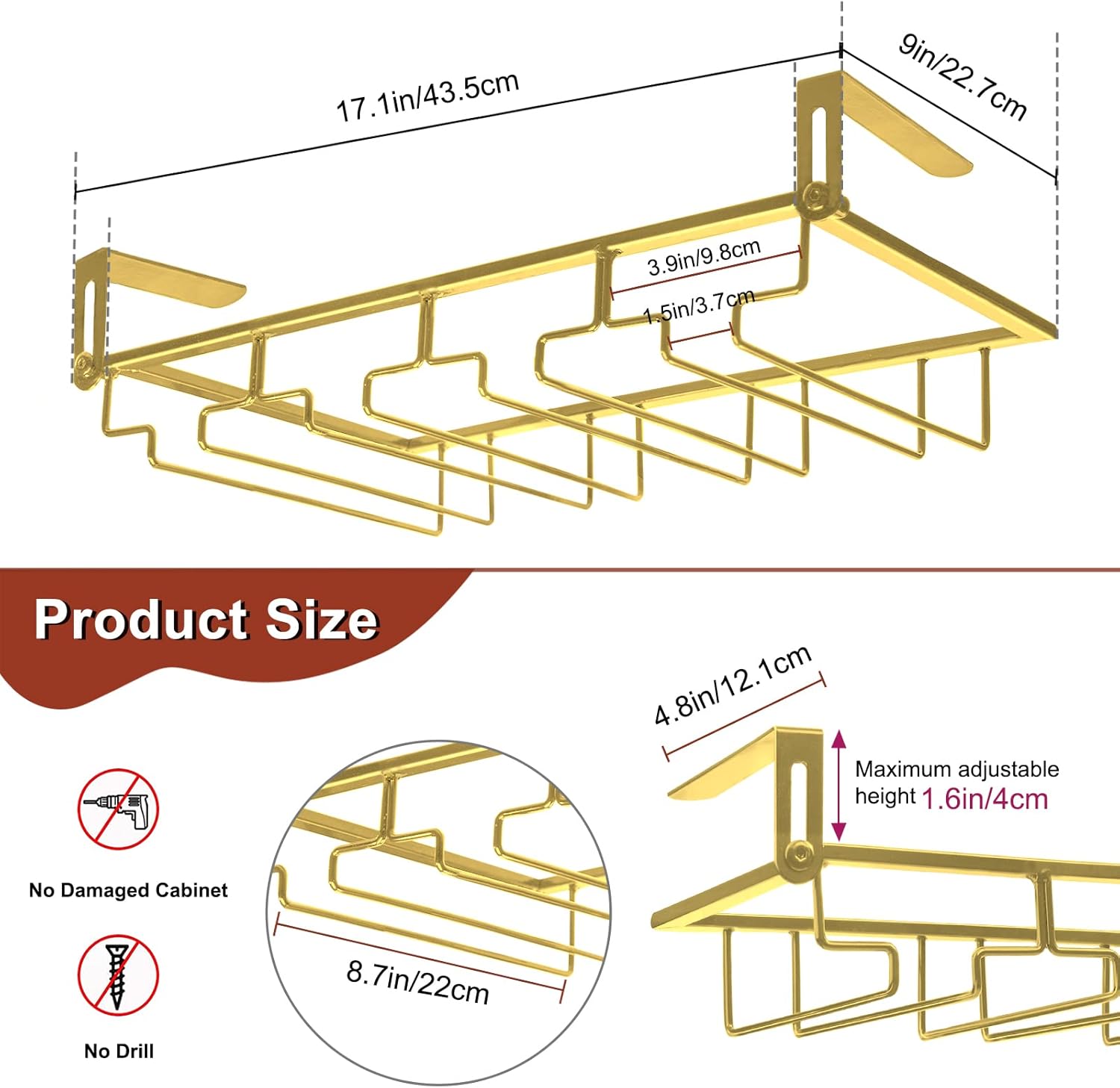 - 【Adiustable Wine Glass Rack】You can adjust the rack's mezzanine width to fit your cupboard, fit for 0.2-1.6in thickness(0.5-4CM). The perforation-free installation design makes the wine glass holder not only suitable for wooden partitions, but also for floating plates of different materials such as stone plates and glass partitions.