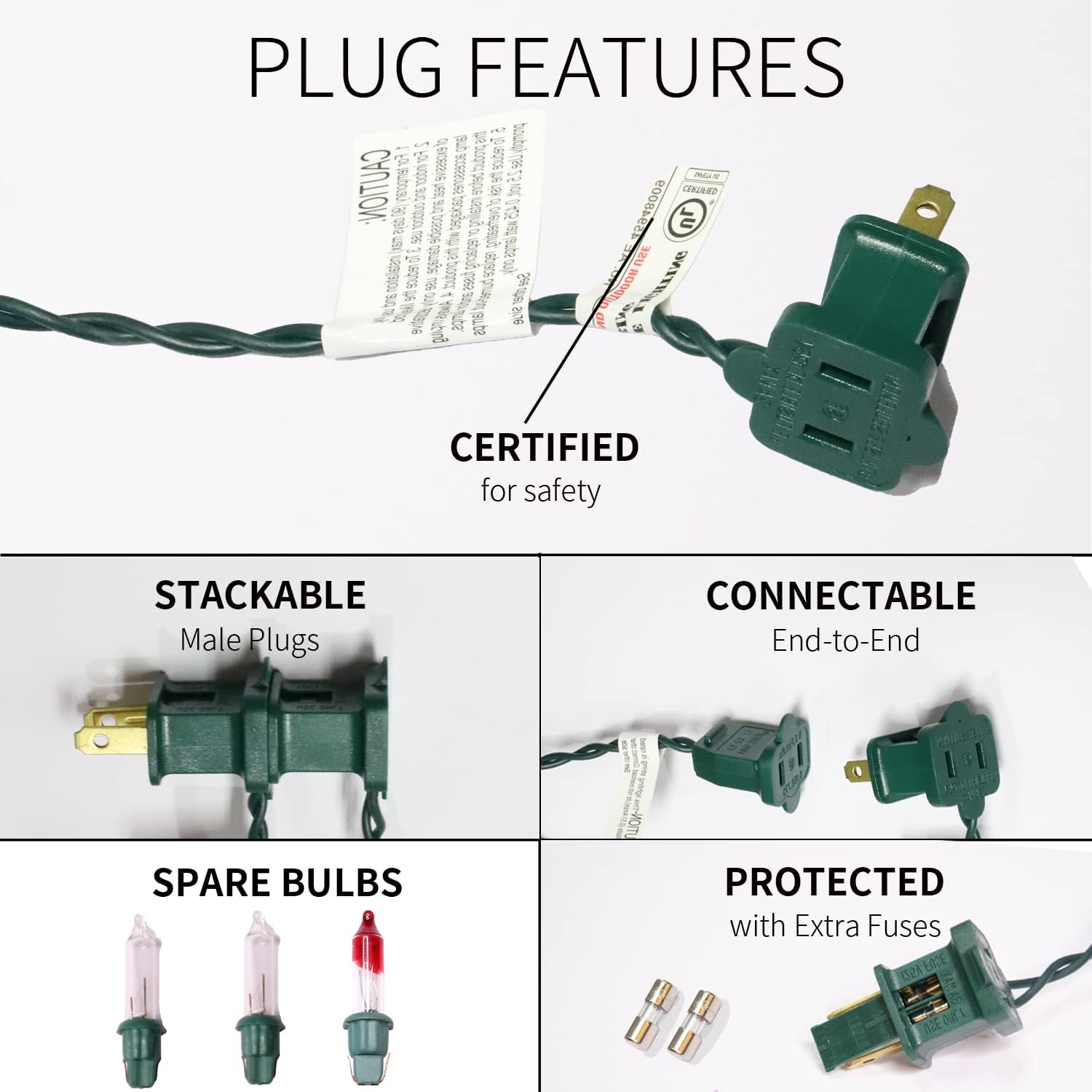 - Product Nature:Each mini Christmas light set comes with end-to-end plug, can be connectable up to 5 sets (500 lights). Each bulb space 2.5in, 2.5V and 0.425W per bulbs, built-in 3A fuse for safe use. Extra bulbs and fuses are included.