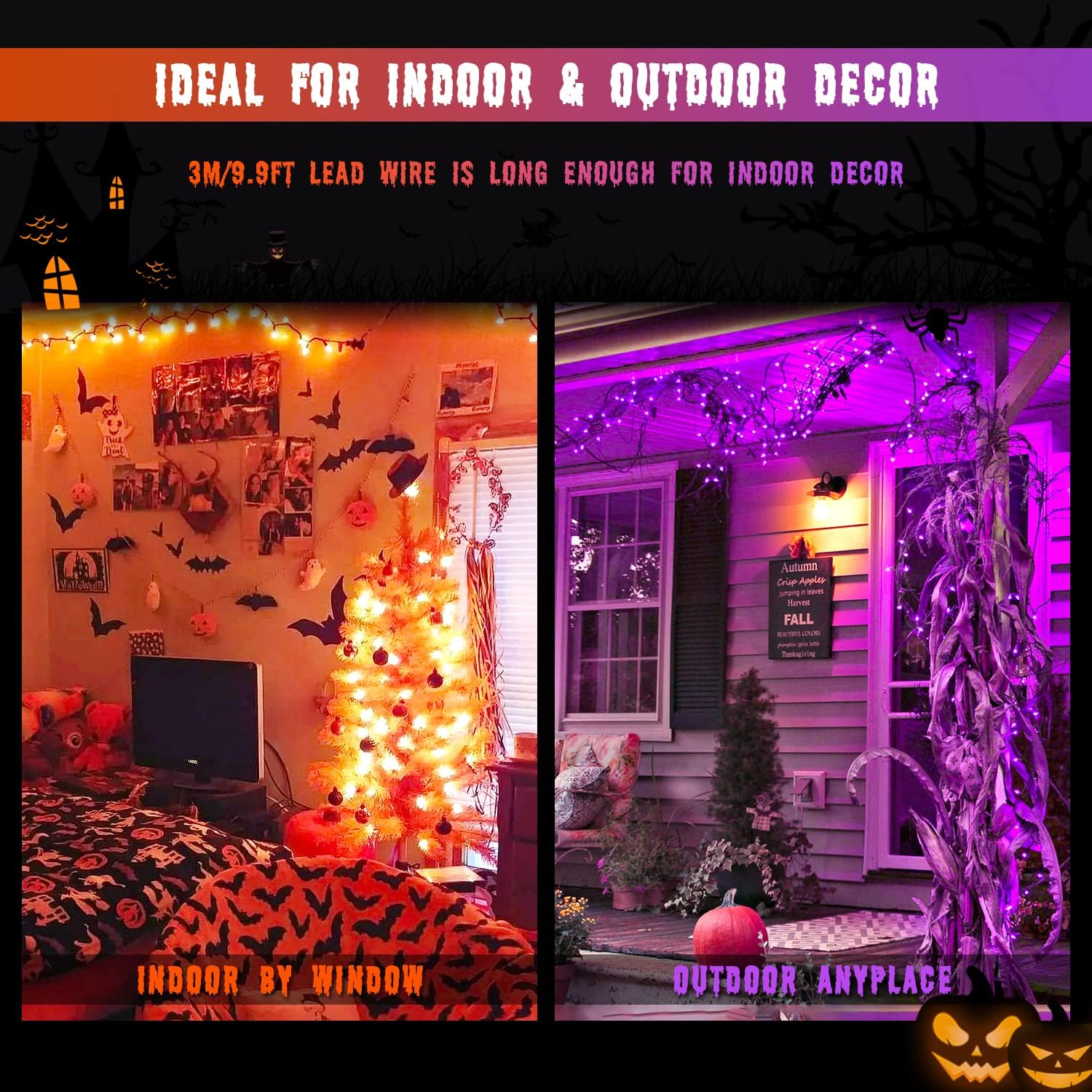 - Widely Used Solar Halloween Lights: Nothing can compete with lightings when it comes to atomosphere building! You definately need our orange and purple Halloween lights to decorate every part of your home for Halloween! The solar string lights is long enough to apply on diverse outdoor scenes such as yard, patios, porches, gardens. More surprisingly! The leading wire is 3m/9.9ft long, so you can put the solar panel near window to absorb the sunlight. Indoor decoration is also great