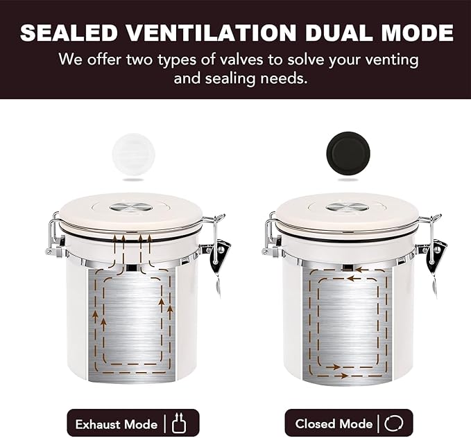 - 【TWO EXHAUST MODES】The canister features a CO₂ valve system and a silicone seal to lock in freshness and keep out moisture and air. A silicone gasket around the edge of the lid ensures an airtight seal when the lid is closed. Storing your coffee beans in this well-designed canister helps extend their freshness and ensures that every cup, even weeks later, tastes as good as the first.