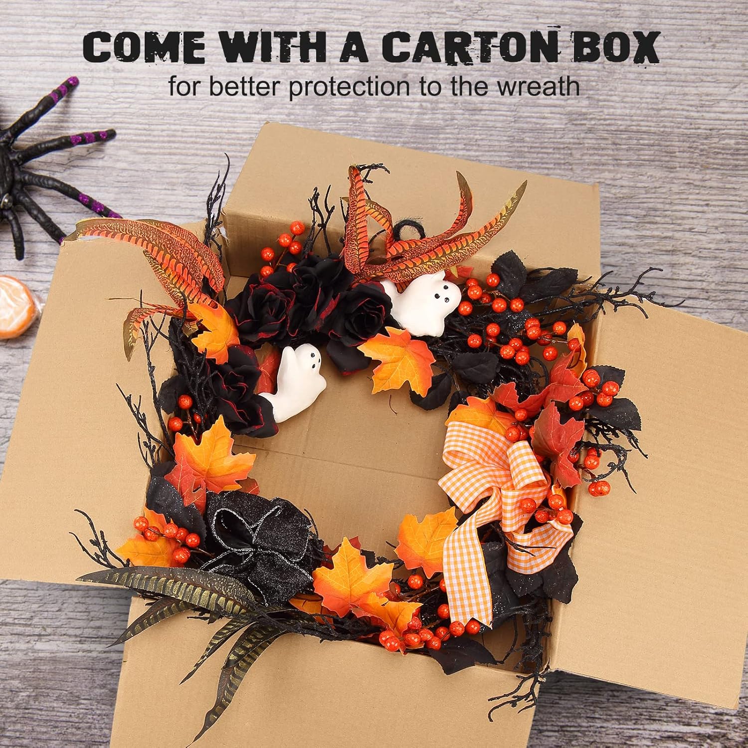 - Unique Halloween Wreath: Our front door Halloween wreath is handmaded on a grapevine base, decorated with white ghost, artificial rose flowers, feathers and ribbon bowknot. Black rattan base and twisty twigs give a spooky vibe. White ghost and orange bowknot add cuteness to the wreath.