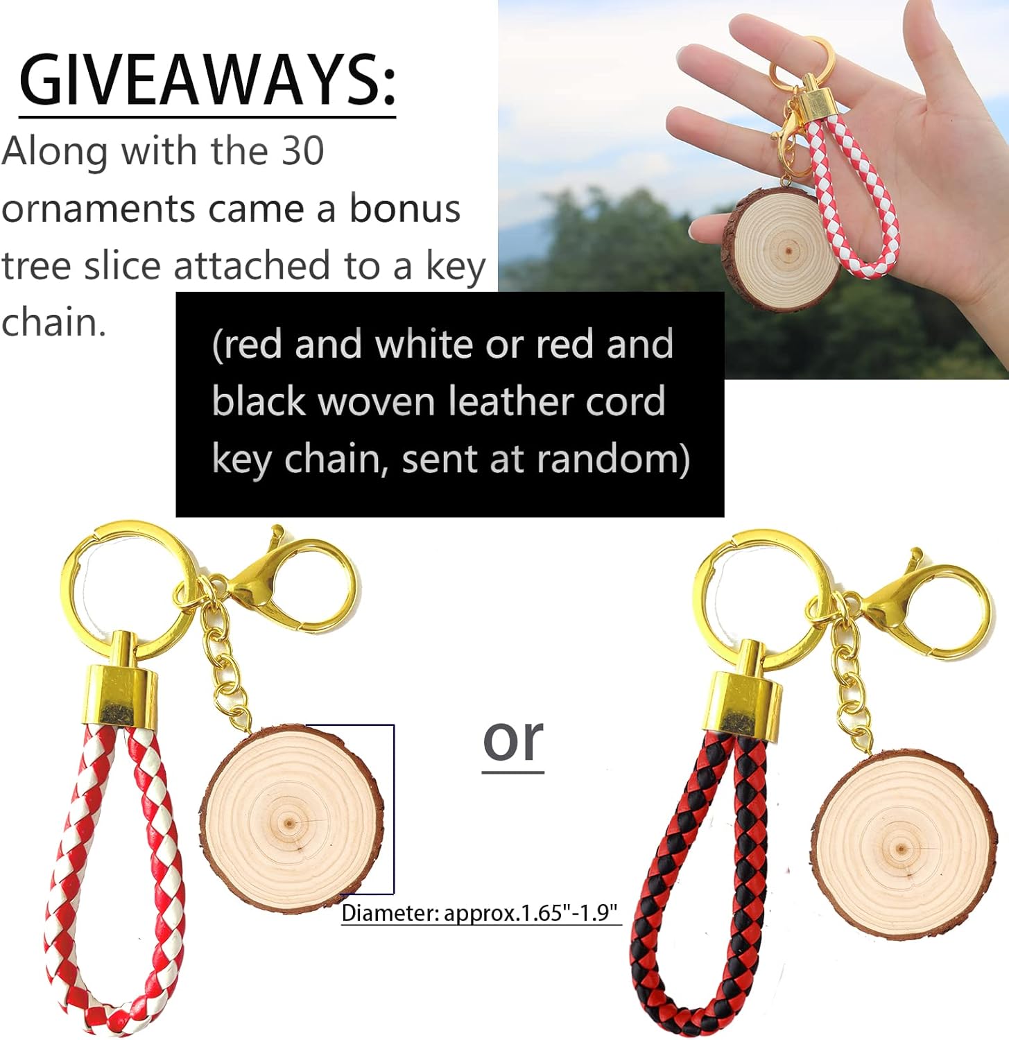 - Package Includes: + 30 Pcs wood craft slice set . Each wood slice was predrilled with a hole , Diameter: approx. 3.1"-3.6" / Thickness: approx. 0.4". + One roll jute twine and one roll of red and white cotton rope,33 feet each. + One bonus tree slice attached to a key chain ,(Red and white or red and black woven leather cord keychain, sent at random).