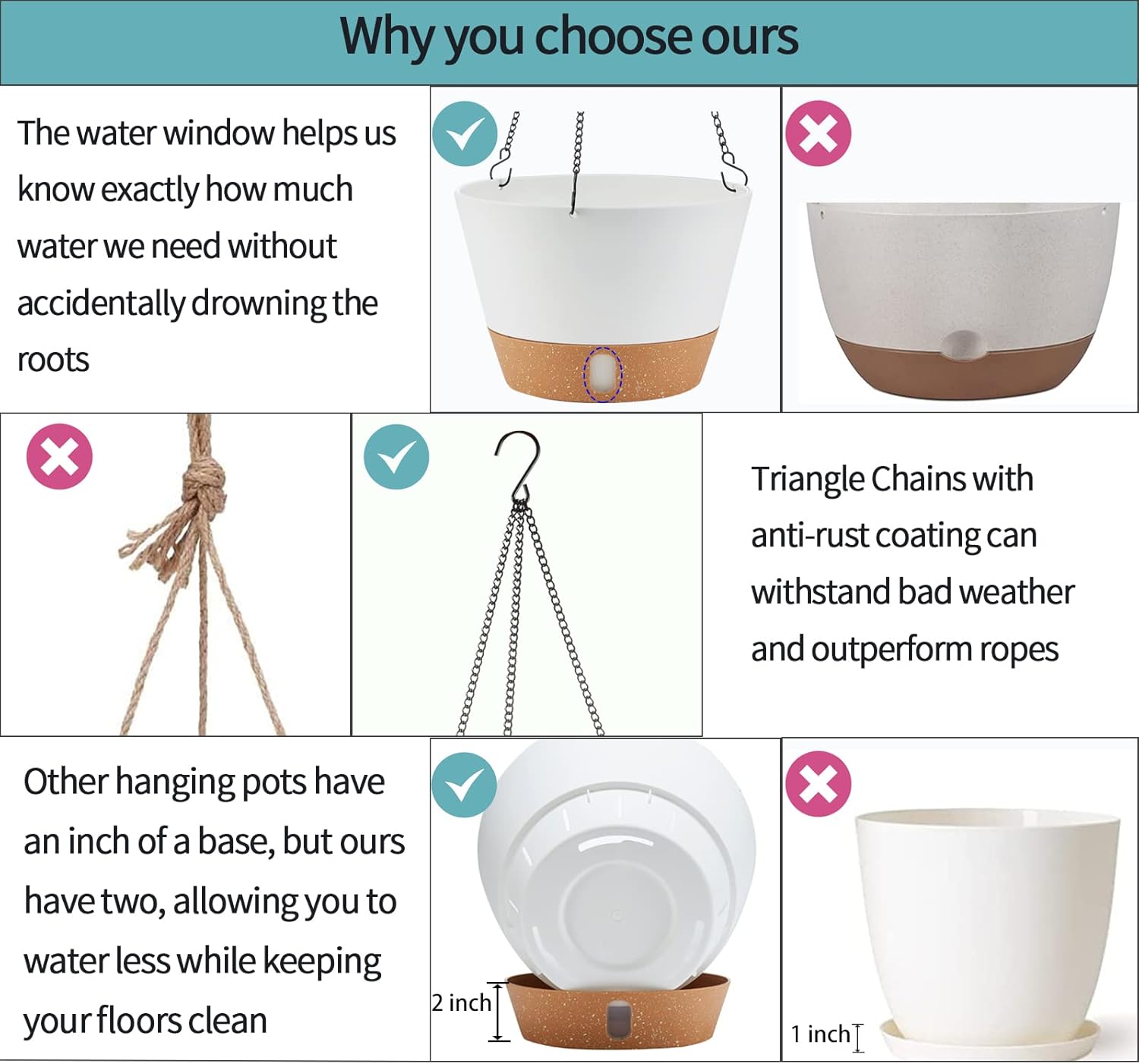 - With Hanging Chain and Hooks:The Chain is made of Stainless Steel and the Surface is plated with an anti-rust coating to further protect the chain from damage. Three Hooks design can increase the stability of the hanging planters. It can withstand inclement weather when used on outdoor plants.