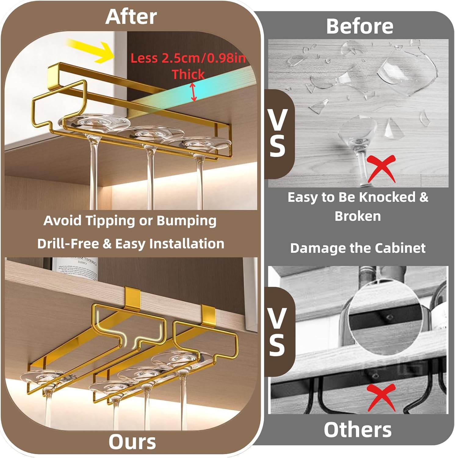 - Affordable Gift For Wine Lovers:this glasses storage holder rack provides a decent holding point and is very stylish.The sturdy materials ensure good strength and longevity. Get more than 2 PCS now for you or your friends who love drinking.Please Measure The Thickness Of The Board Of The Shelf Or Cabinet Before Purchase