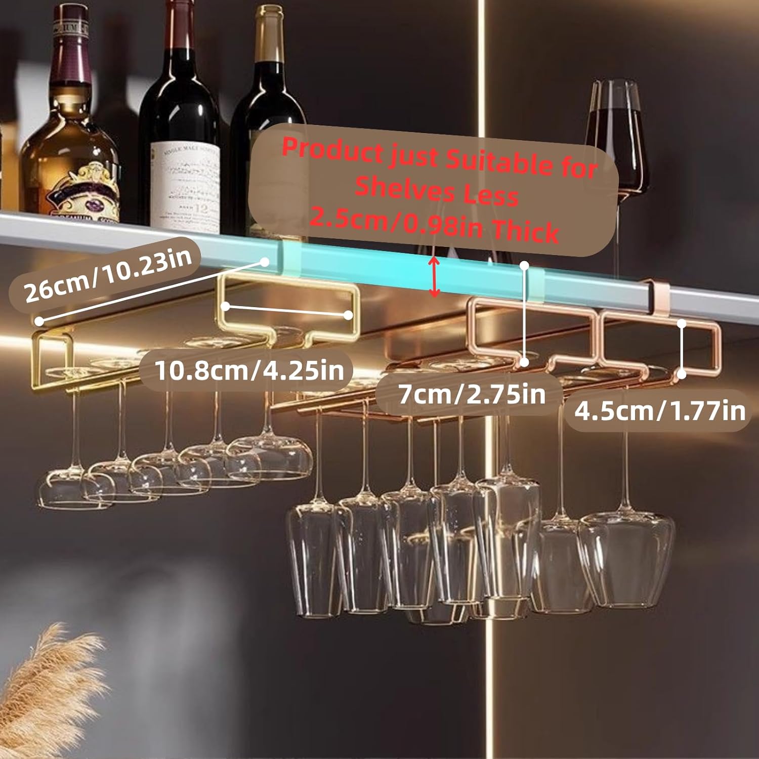 - PLEASE PAY ATTENTION:Please Measure The Thickness Of The Shelf Or Cabinet Board Before Purchase. This wine glass rack is only suitable for shelves less than 2.5 cm (0.98 in) thick. For cabinets or shelves with doors, its thickness may prevent the door from closing tightly. The best installation position is the location corresponding to the door handle, which can minimize the impact.