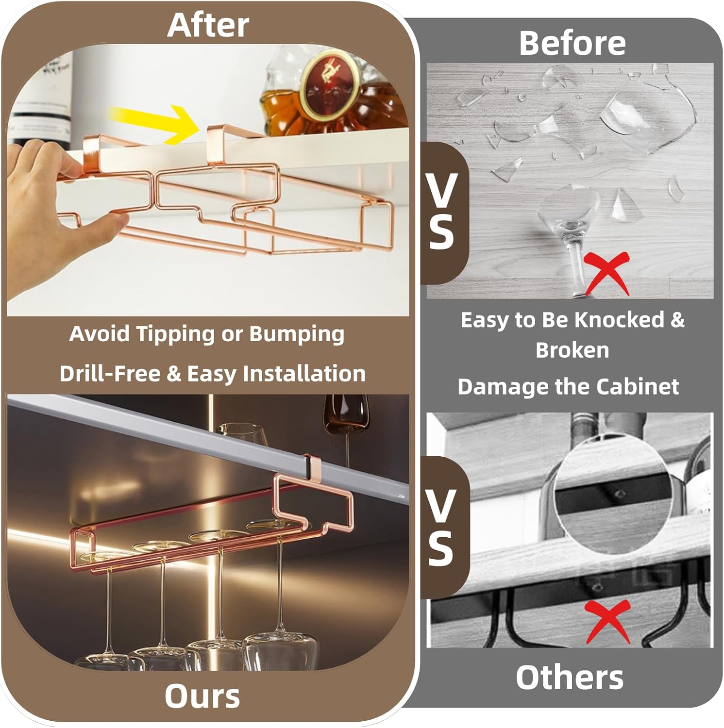- Drill-Free & Easy to Install: No drilling is required. This wine glass rack can securely hold your wine glasses without worrying about accidental slippage or falling. The smooth black finish prevents any scratching or chipping on the surface of the wine glasses. It's very easy to clean and not easily stained.