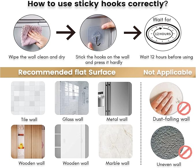 - 【How to Use】1) Stick the hook on any smooth clean dry surface and press it tightly to remove any bubbles. 2) Wait 12 hours to adhere the hook firmly. 3) Finally, you can hang the hanging bag on the hook to enjoy it.