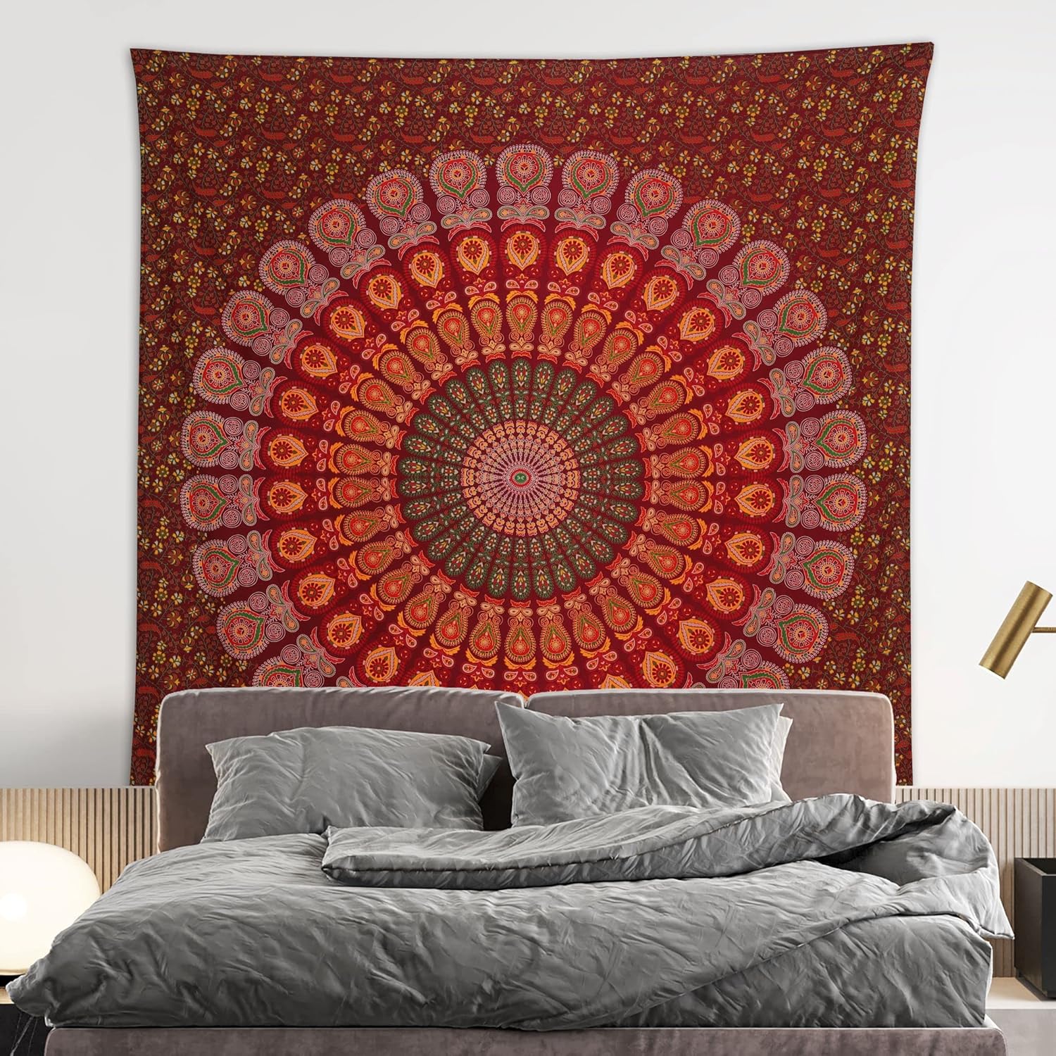 Bless International Handmade Indian hippie Bohemian Psychedelic Peacock Mandala Wall hanging College Dorm Beach Throws Table Cloth Bedding Tapestry (Maroon Yellow, Queen(84x90Inches)(215x230Cms))