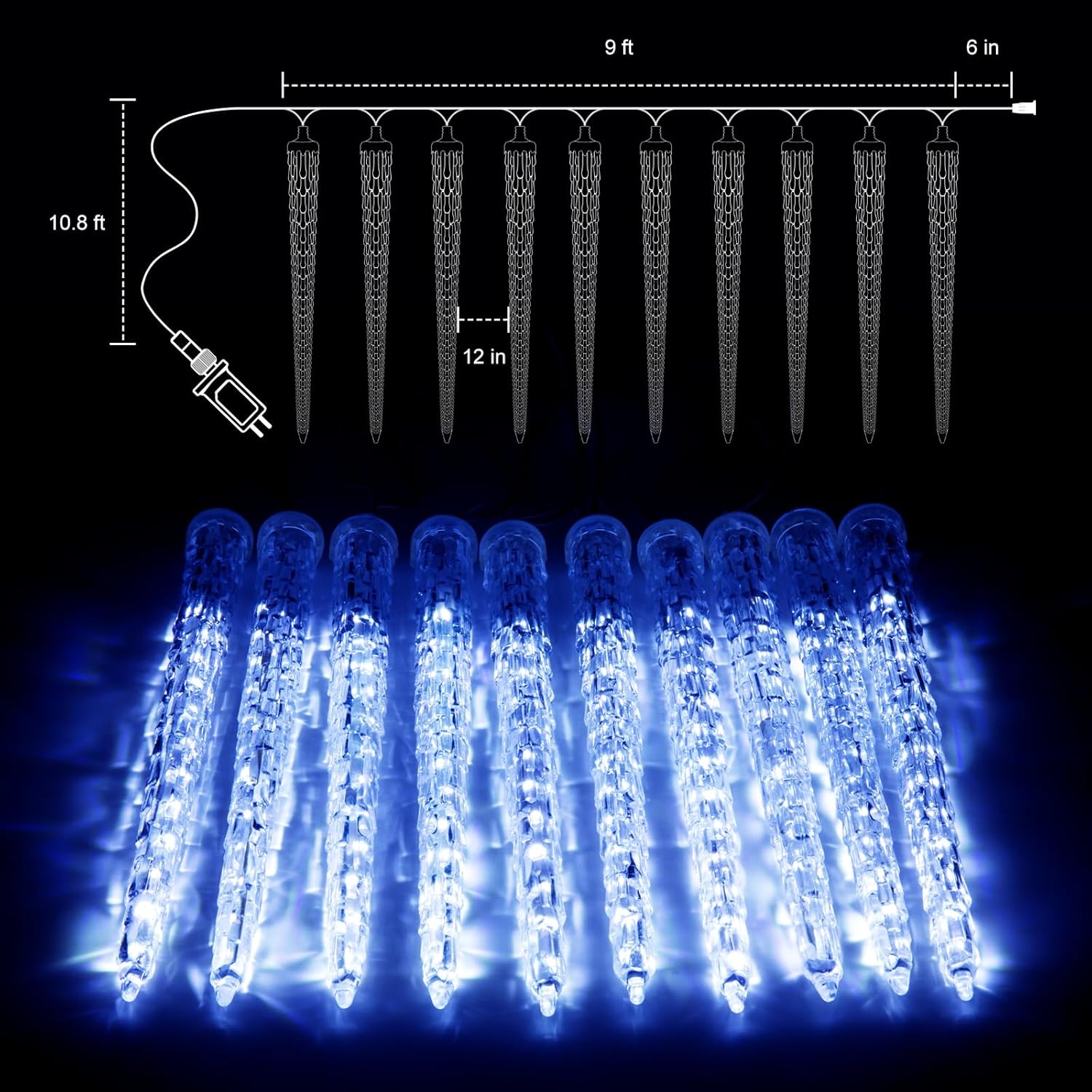 Christmas Icicle Lights Outdoor, 10Ft. Meteor Shower Lights with 10 Large Icecycles, Snowfall Shooting Star Light Effect, Falling Crystal Christmas Decorations for House Eave Roofline Patio, Blue