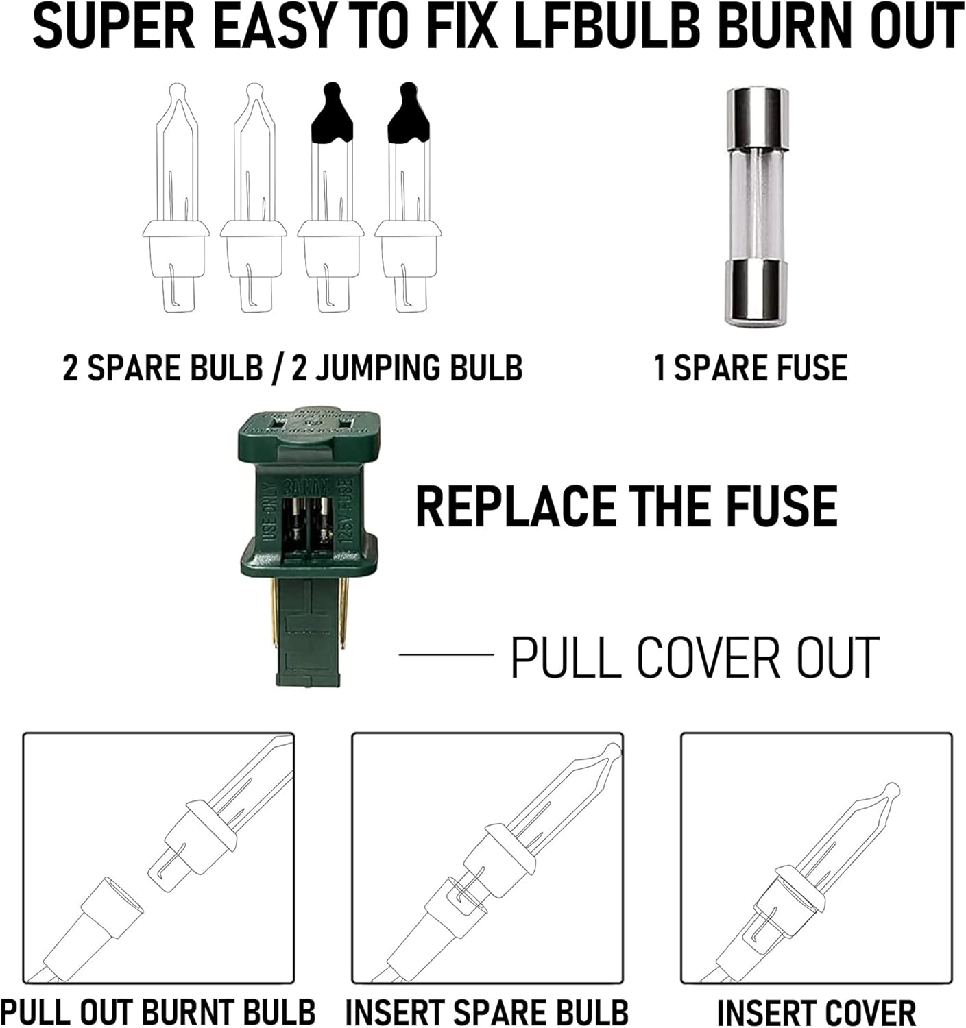 - Christmas Lights: Includes 3 x 20 ft light strings, 3 x spare fuses, and 12 x additional incandescent bulbs for a total of 100 bulbs