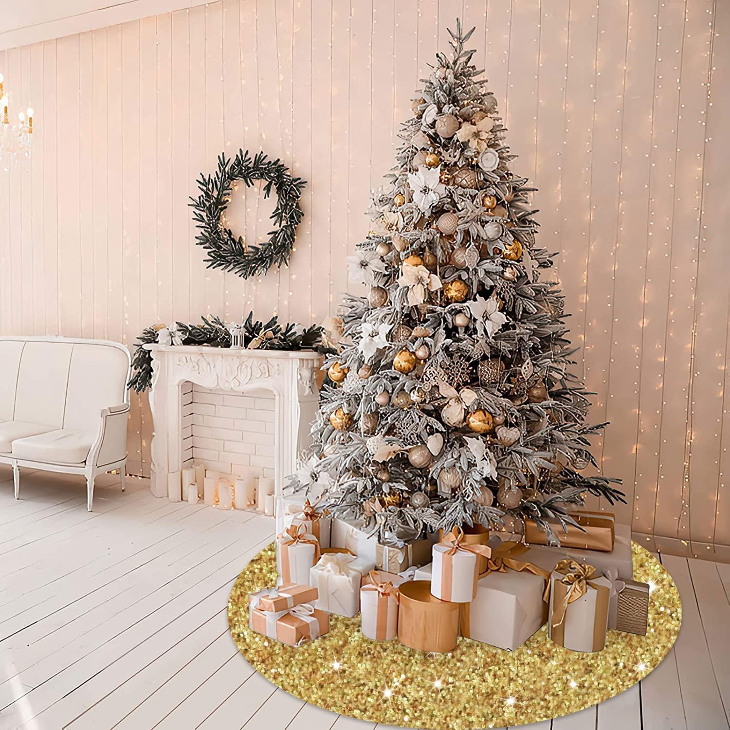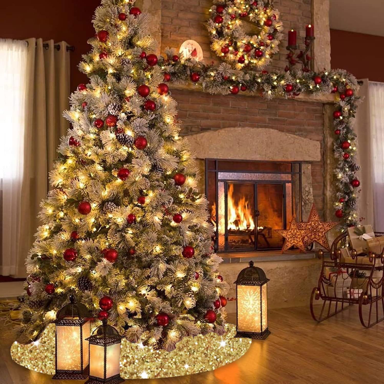 - ❄️【Size Detail - Sequin Tree Skirt】You will receive a 46 inches diameter gold glitter sequins tree skirt, fits under 8 foot tall trees. You can put some gifts, Christmas boxes, Christmas ball on the xmas tree cover mat. The sparkle velour Christmas tree skirts is perfect for decorating your home and become part of your holiday tradition.