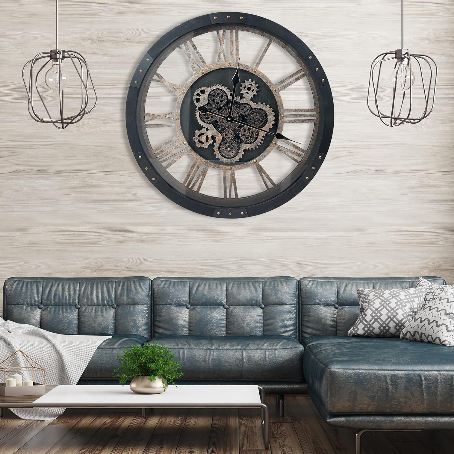 DORBOKER 24" Large Wall Clock with Moving Gears,Oversize Vintage Industrial Rustic Farmhouse Clocks for Living Room Decor Office Home,Solid Wood HD Tempered Glass Cover,Vintage Black