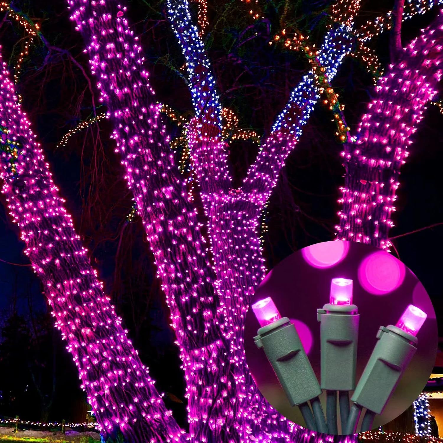 - High quality: Commercial grade 22 gauge wire with a pure copper core, wrapped in rubber that is infused with fire resistant materials, for longer runs and extended life. These 5mm feature a concave lens design that disperses uniform light in all directions for amazing color. You never have to worry about the string lights being buried in the bush.