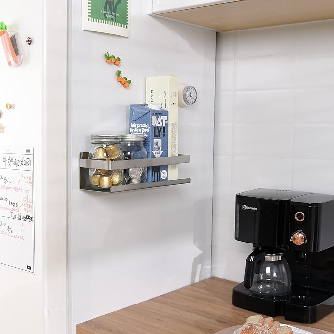 - Space Saver: The magnetic rack is a great way to store spices, save your precious countertop/ cabinet space, and keep them clear of clutter. Suitable for spice jars, pepper, salt, sugar, a jar of olive oil, cooking oils, pepper, or other small things.