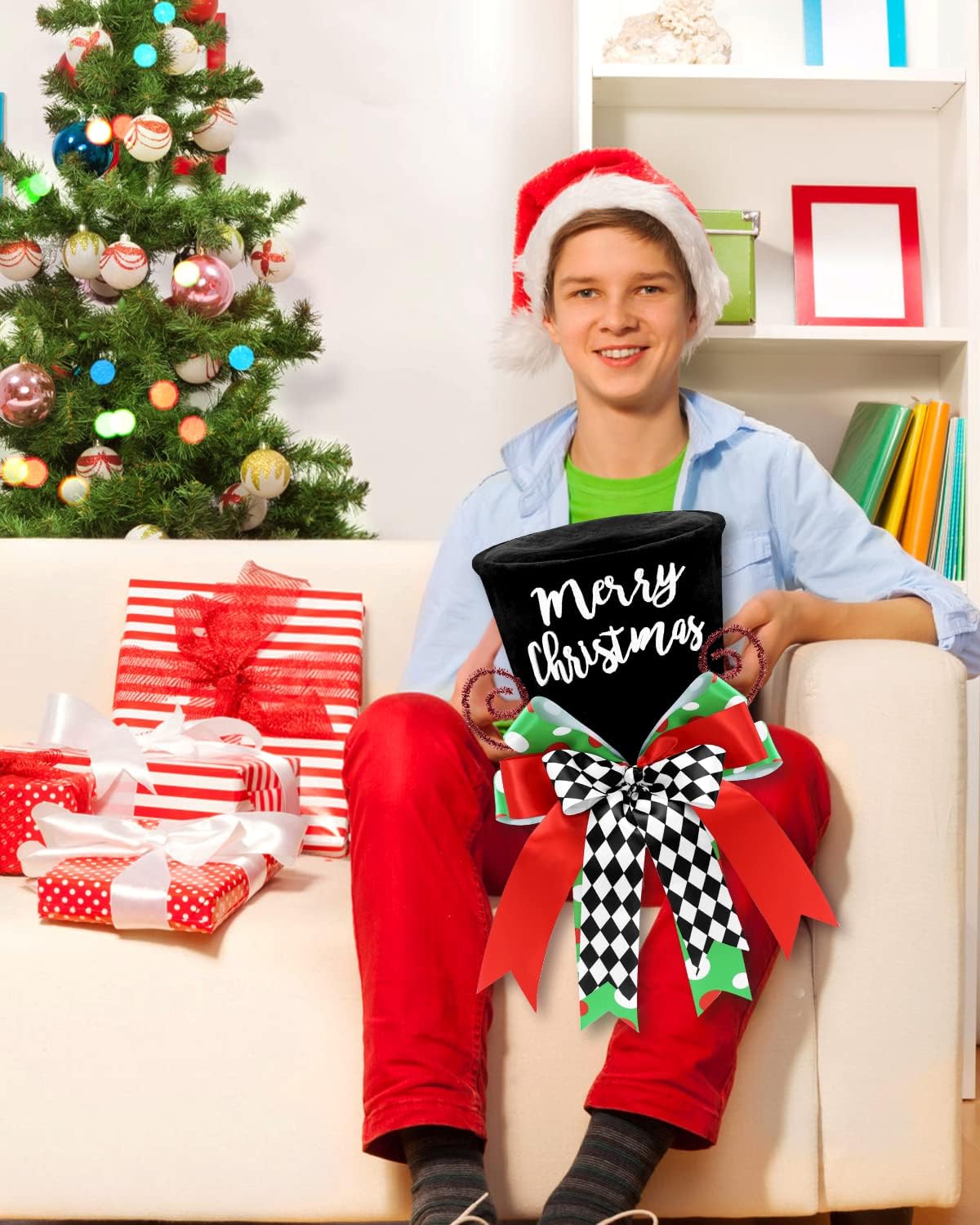 Merry Christmas Tree Topper Whimsical Top Hat with Check Bows Xmas Tree Ornament Winter Holidays Home Decoration Wreath Attachment Festive Gift Ideas Supplies