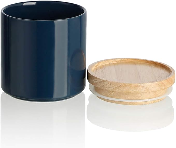 Sweejar Kitchen Canisters Ceramic Food Storage Jar, Stackable Containers with Airtight Seal Wooden Lid for Serving Ground Coffee, Tea, Sugar, Salt and More - 16 Fl Oz (Navy New)
