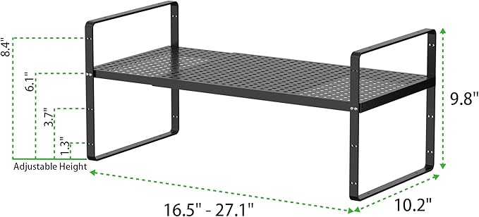 - Adjustable Shelves: This cabinet shelf organizer extends in length and adjusts in height to fit any space you need. The original shelf (collapsed) measures 16.5" L x 10.2 " W x 9.8" H. The length can be extended from 16.5 inches to 27.1 inches. This expandable cabinet shelf provides three levels of board height adjustment from 5.7 inches to 8.5 inches. You can tailor each shelf with adjusting screws on both sides of the shelf frame