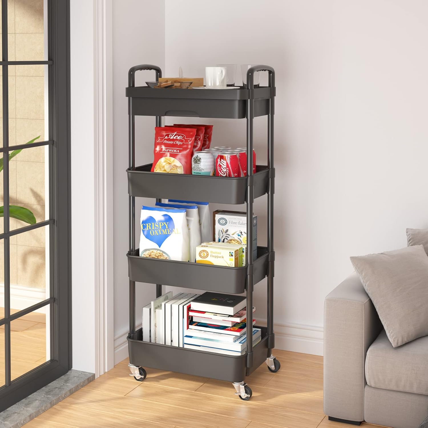 Calmootey 4-Tier Rolling Utility Cart with Drawer,Multifunctional Storage Organizer with Plastic Shelf & Metal Wheel,Storage Cart for Kitchen,Bathroom,Living Room,Office,Black