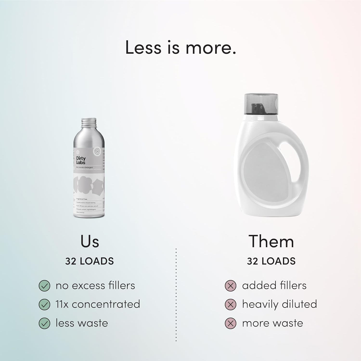 - SPECS: 8.6 fl oz = 32 loads. Free & Clear (Scent Free). Compatible with traditional and HE washers. Optimized for cold water. Safe for sensitive skin and dermatologist tested. Recognized by the National Eczema Association (NEA). No sulfates, dyes, parabens, preservatives, chlorine bleach, or CA Prop.65 Chemicals. Visit our store for more ingredients information. Dirty Labs is cruelty-free, vegan, hypoallergenic, and safe for babies and pets.