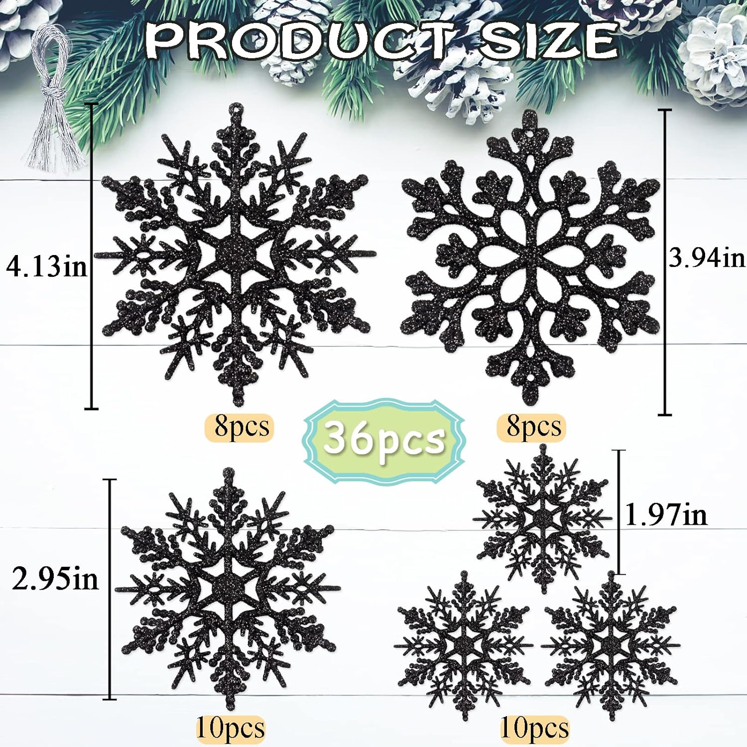- Package:You will receive a great value pack of 36pcs black snowflakes decorations (2 patterns) in 4 varied sizes: 8pcs for 4.2 inches, 8pcs for 4 inches, 10pcs for 3 inches, and 10pcs for 1.8 inches. It also comes with a bundle of string for easy assembling and hanging