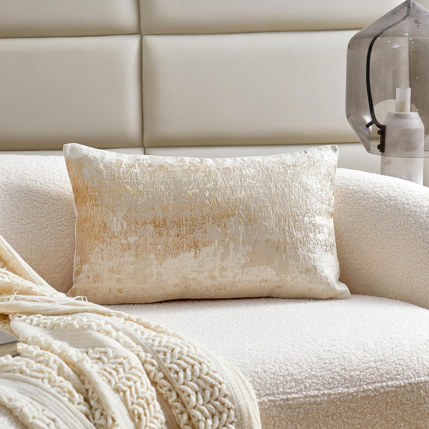 THE-TINOART Cream Beige & Gold Luxury Pillow Cover 12x20 - Embroidered Jacquard with Metallic Thread, Reversible Decorative Throw Pillow Cover for Sofa/Bed, Velvet Backing
