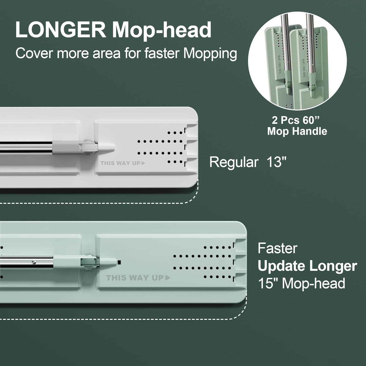 - [Longer and Larger Mop Bucket] Includes a X-Large Green Bucket #5, two Extended 60" handle with Bigger 15" flat head mops! Suitable to be a wall mop or a wall cleaner with long handle. Self cleaning mop with the larger bucket, SAVE your time and labor, let the bucket do more than by yourself, mopping is just between mop and bucket, be free from dirty water, All you need to do is moving the squeeze mop
