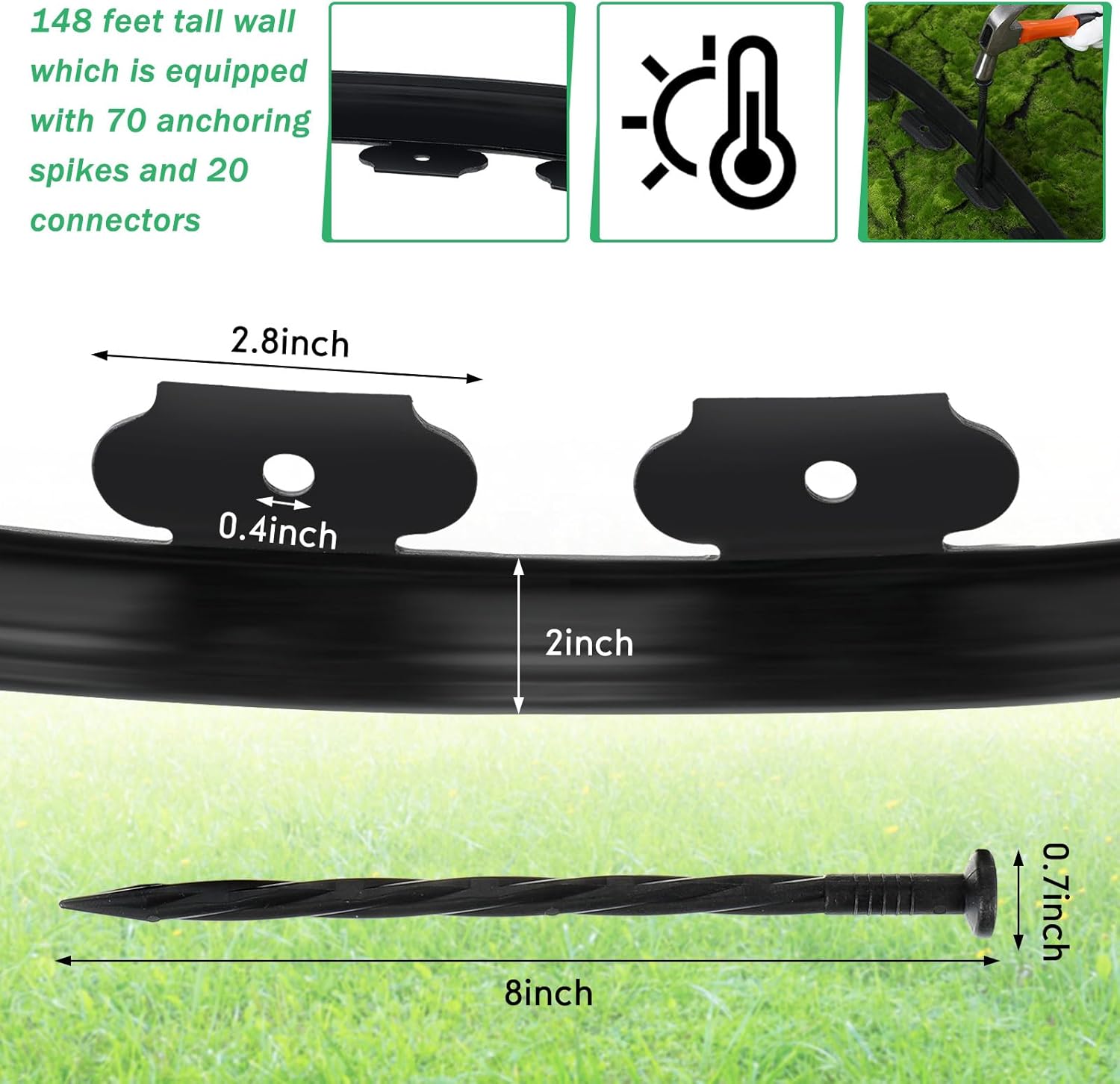 - What You Will Get: edging roll kit includes 148 feet tall wall landscape edging, which is equipped with 70 anchoring spikes and 20 connectors, sufficient number of anchoring spikes and long landscape edging can meet your daily use needs
