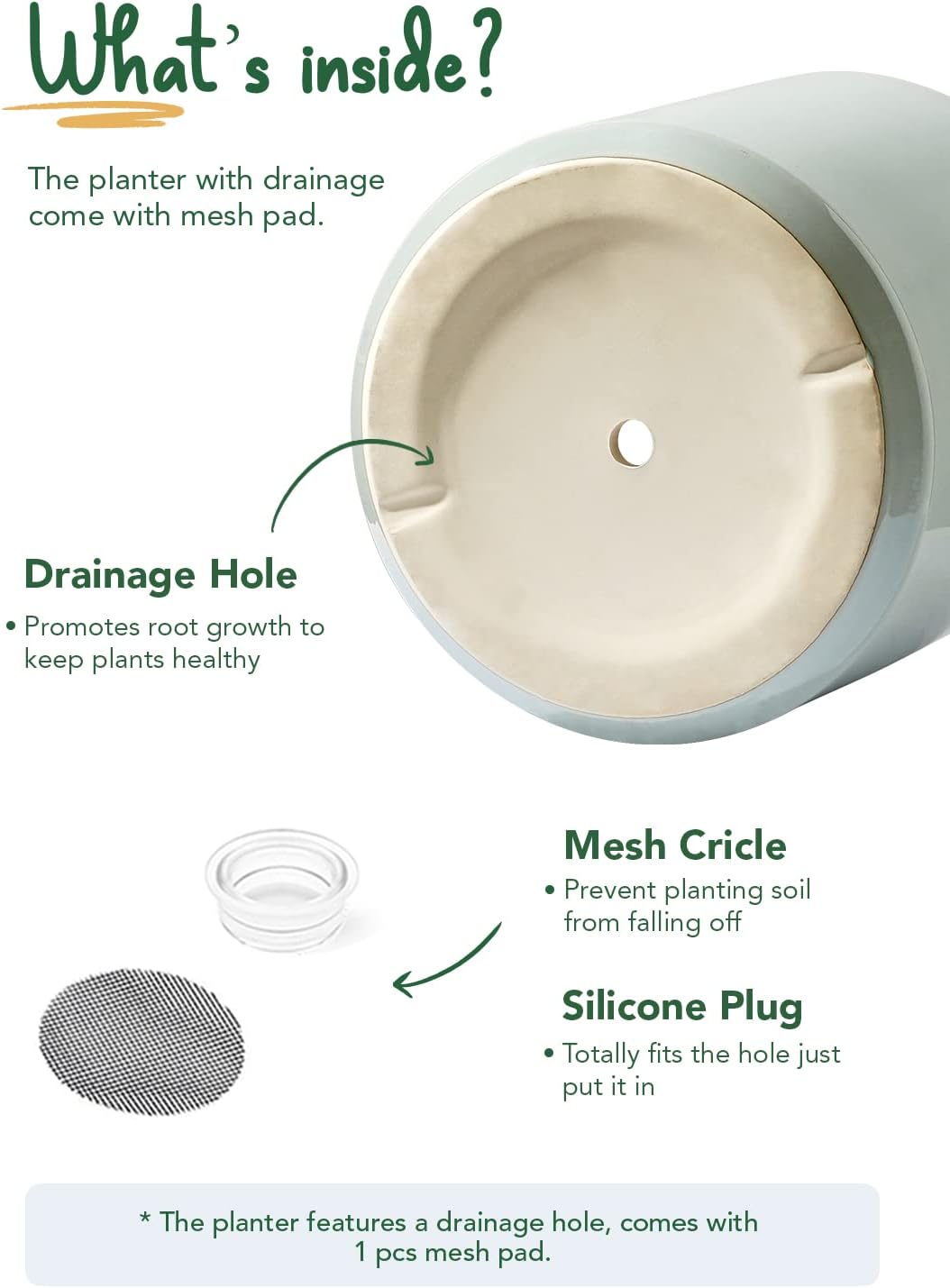 - Silicon Plug & Drainage Hole & Net Included: To drain or not to drain, it's all up to you; Roots love moisture but are afraid of excessive water; Use a silicon plug to prevent water leakage, or cover the drainage hole with a mesh pad to prevent soil loss, offering good ventilation for plants to breathe freely (Plant is Not Included)