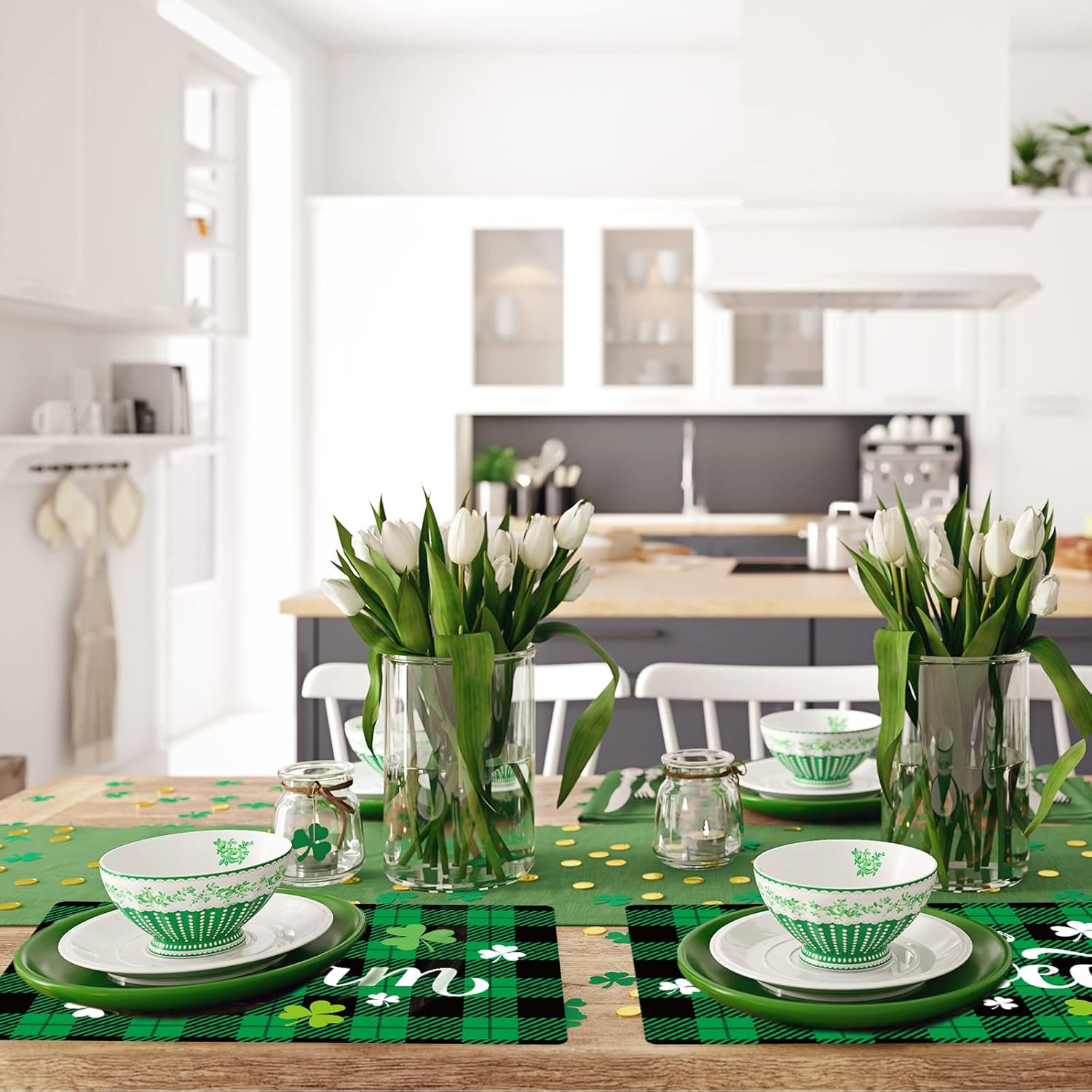 - 【Eye-Catching Design】This St. Patrick’s Day table mats is designed in green buffalo plaid and vibrant shamrock, blessed holiday words and other St. Patrick’s Day theme patterns. Decorating your St. Patrick’s Day theme dining table with these lucky shamrock dining table mats will add luster to your table and create a cheerful St. Patrick’s Day atmosphere for party.