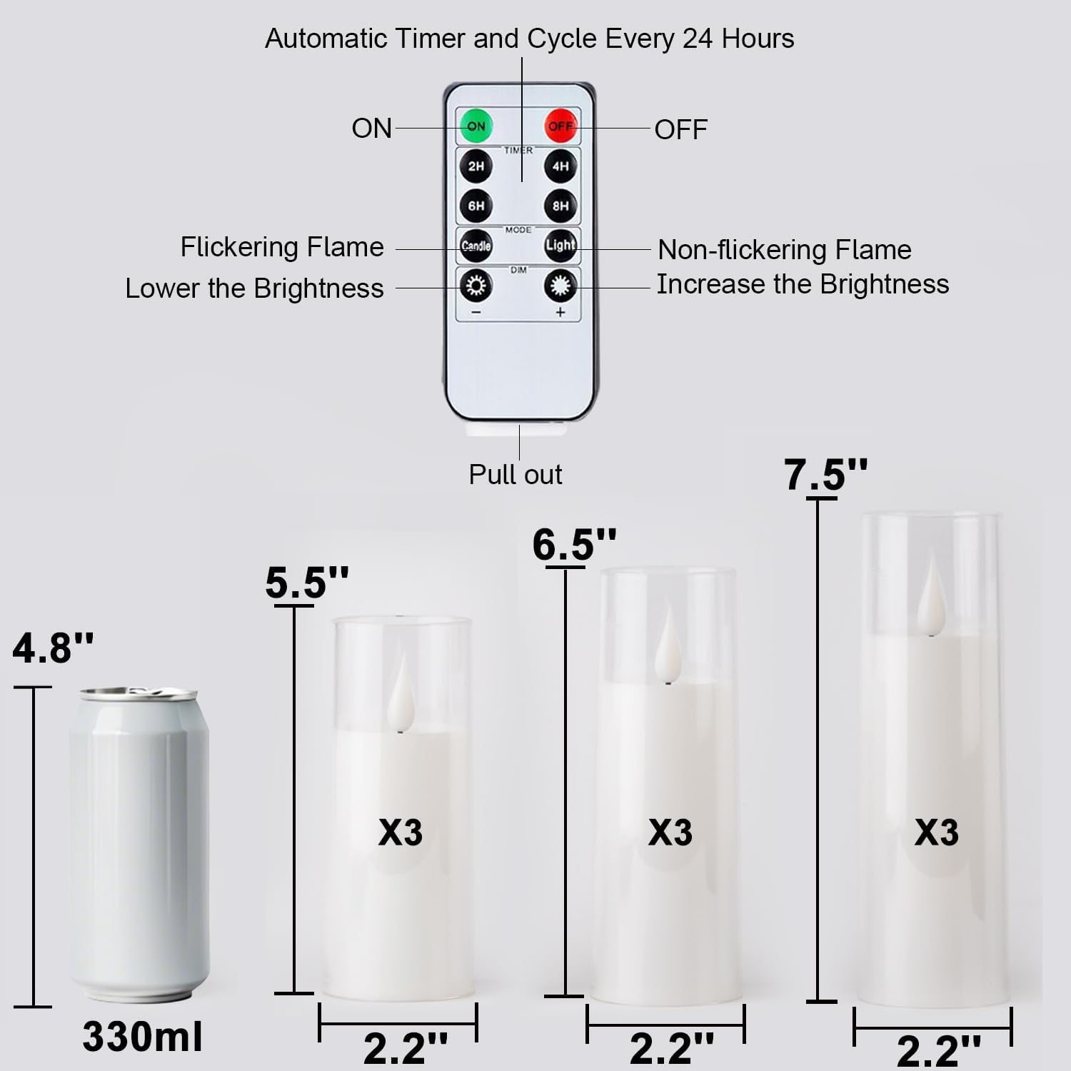 - Package Include: This battery operated candle set includes 9 flameless pillar candles( D2.2”x H5”6”7”), two 10-key remote control, one user manual. Each flameless candle powered by 2 x AA batteries (not included) which can last for 500+ hours