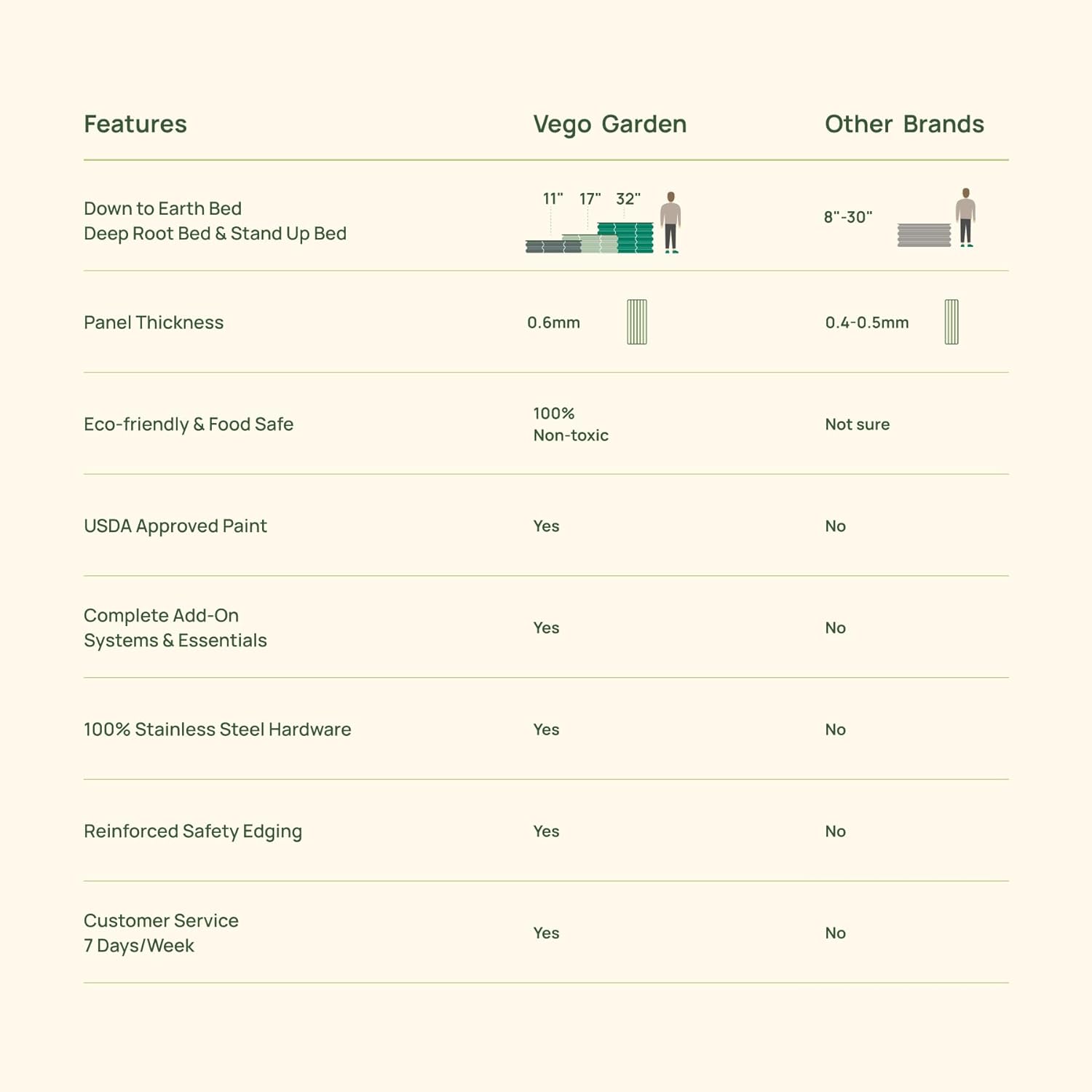 - Complete System: From the very beginning, Vego Garden has aimed to create unified gardening systems that start outside, in your garden, and extend all the way into your day-to-day today life. The team continues to develop more products and add-ons that enhance the Vego experience, such as cover system, worm composters, arched trellis, wall trellis, seeding trays and gopher net and so on. Beyond the physical product, education and community are an integral part of the Vego Garden system, we will continue to strive for these values from design to customer