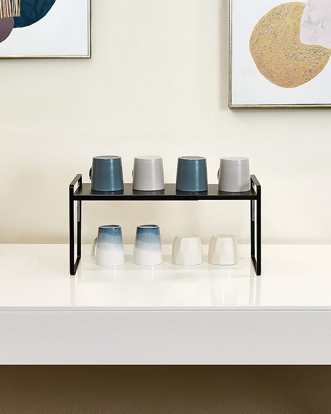Nxconsu Cabinet Shelf Expandable Height Adjustable Organizer Riser for Kitchen Cabinet Pantry Cupboard Under Sink Countertop Organization Storage Space Saver Stackable Heavy Duty Metal Black