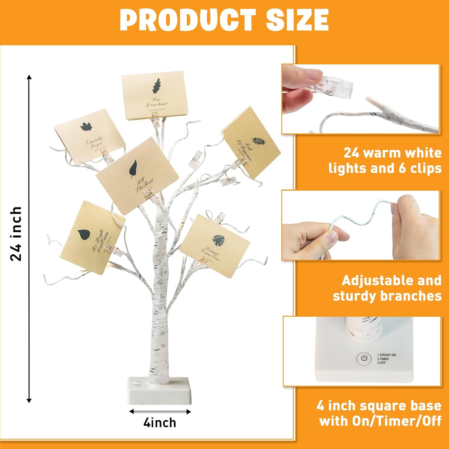 - As Perfect Gift: You will receive small 2 FT artificial birch tree. The tree is 4 x 4 x 24 inch with 24 LED warm white lights and USB charging cable. 6 clear clips and 6 greeting cards. You can write your wishes on the cards, send your blessings, great graduation gifts for her / him