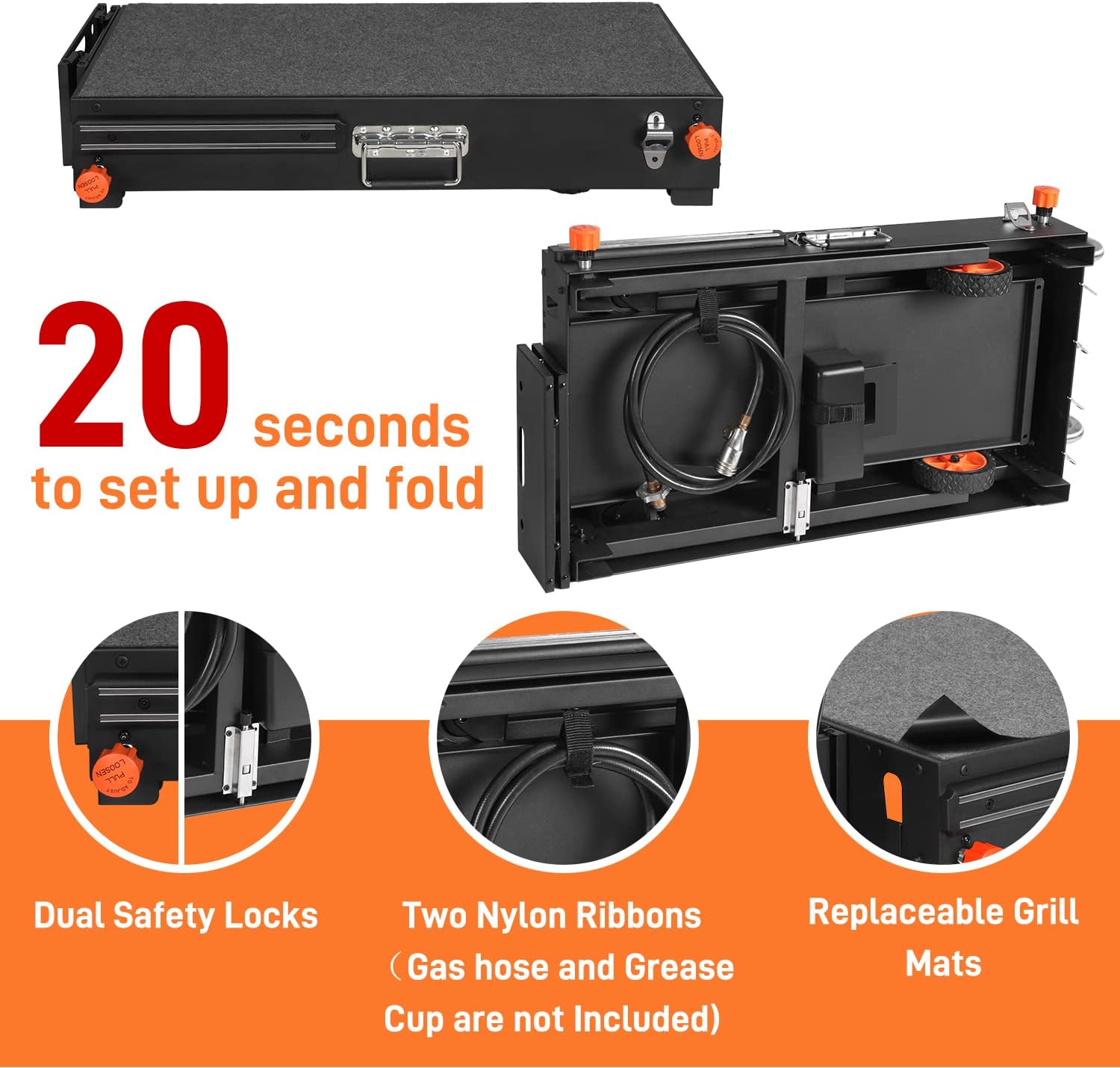 - The Best Blackstone Griddle Accessories - Exclusive Features lineup - Biggest Size in the Class, Double-shelf, Foldable caddy, Two 6" Wheels & Two Swivel Caster Wheel with Lock, Magnetic Tools Holder, Replaceable Table Mat, 2 Nylon Ribbon Strip for Propane Gas Hose & Grease Tray Management, Bottle Opener, Paper Towel Holder etc. Exclusive Dual Safety Features, Blackstone table individual safety lock for each legs frame, stainless steel lock to fix the position of legs frame during transportation. Applied for appearance patent.