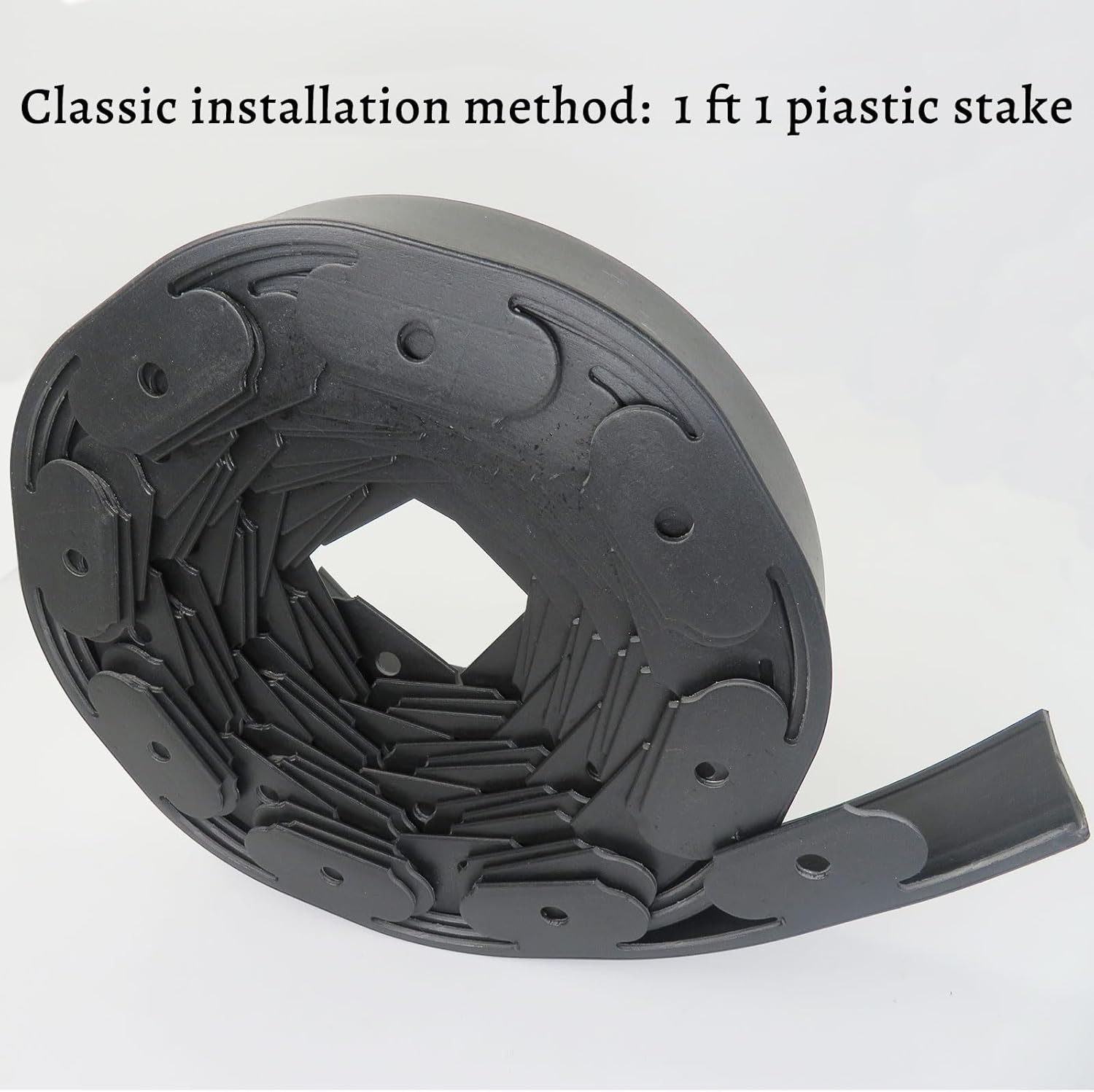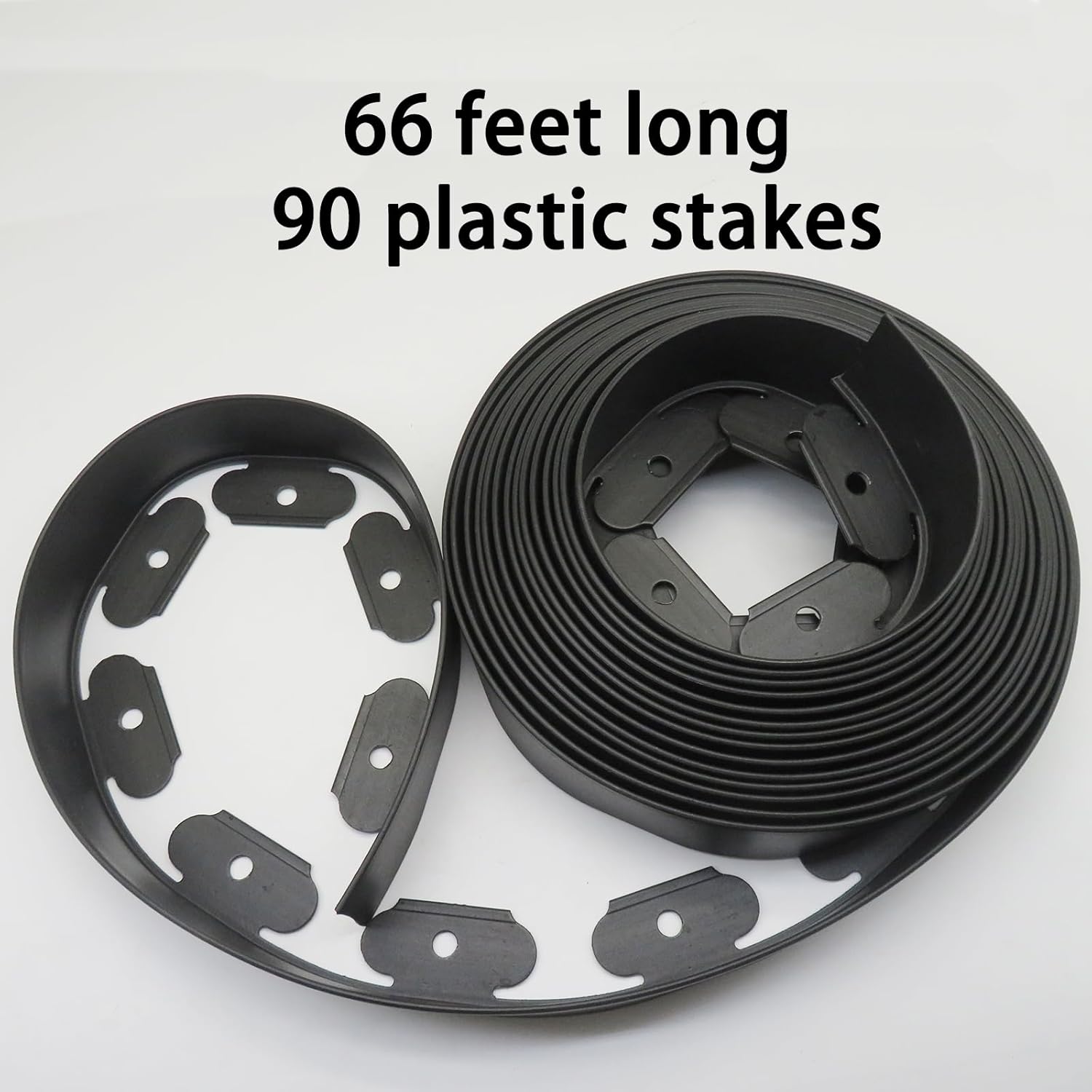 - 【Product Dimensions】The landscape edging border kit,black, includes a 66 ft. coil of landscape edging,2inch tall,90pcs plastic stakes,and 1 metal stake. The garden bed border kit are recommended to use 1 spikes per 1ft. to secure the landscape borders.