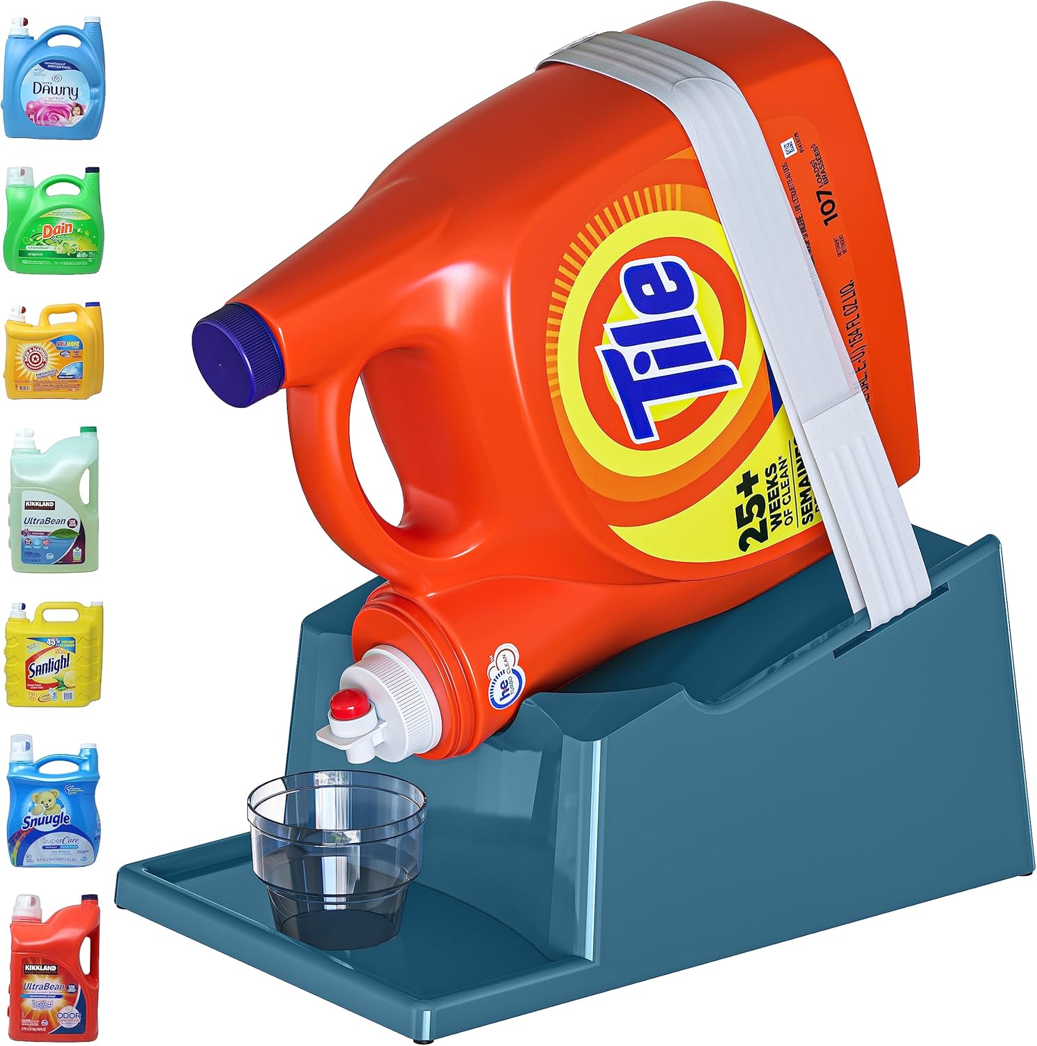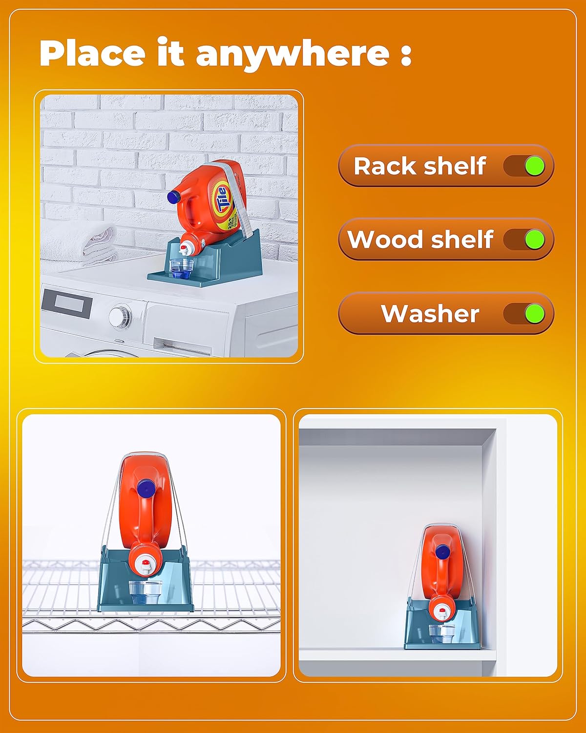 - [No more messy Shelves]: The molded edge of this laundry detergent dispenser holder, holds your measuring cup securely, preventing soap drips and messes from spilling onto your shelves or floors, keeping your laundry area clean.
