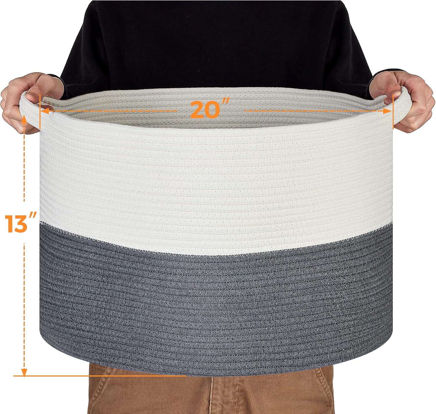 Ravinte Blanket Basket - 20"x 20"x 13" Cotton Rope Basket for Living Room, Baby Toy Storage Basket, Large Woven Laundry Basket (White-DarkGray)