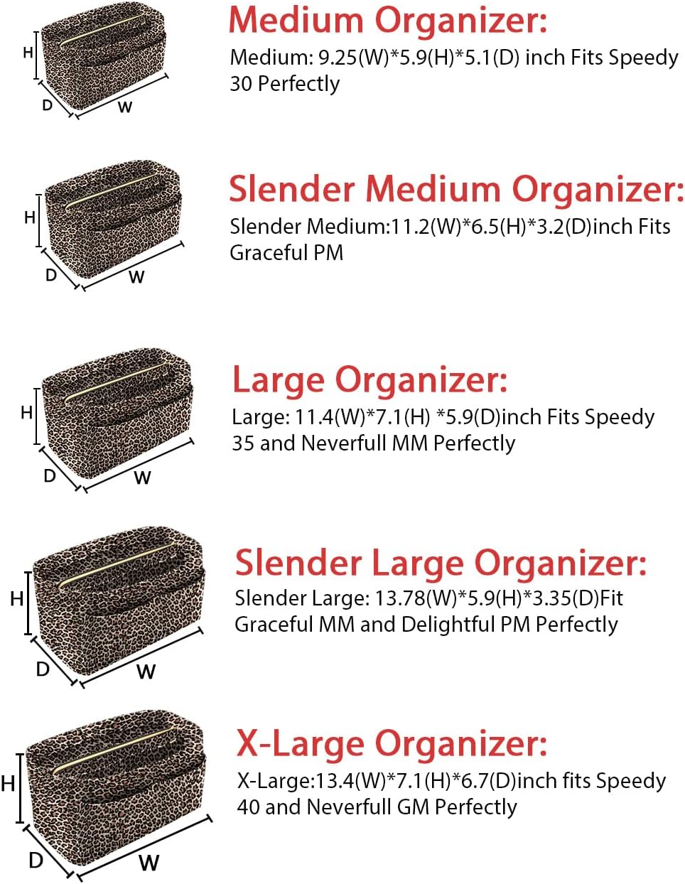 - SIZE OF BAG ORGANIZER: Medium: 9.25(L)*5.9(H)*5.1(W) inch Fits Speedy 30 Perfectly. Slender Medium: 11.2(L)*6.5(H)*3.2(W)inch Fits Graceful PM. Large: 11.4(L)*7.1(H) *5.9(W)inch Fits Speedy 35 and Neverfull MM Perfectly. Slender Large: 13.78(L)*5.9(H)*3.35(W)Fit Graceful MM and Delightful PM Perfectly. X-Large:13.4(L)*7.1(H)*6.7(W)inch fits Speedy 40 and Neverfull GM Perfectly. Portable and Compact Purse Perfectly For any Brand.L*H*W means (Length*Height*Width)