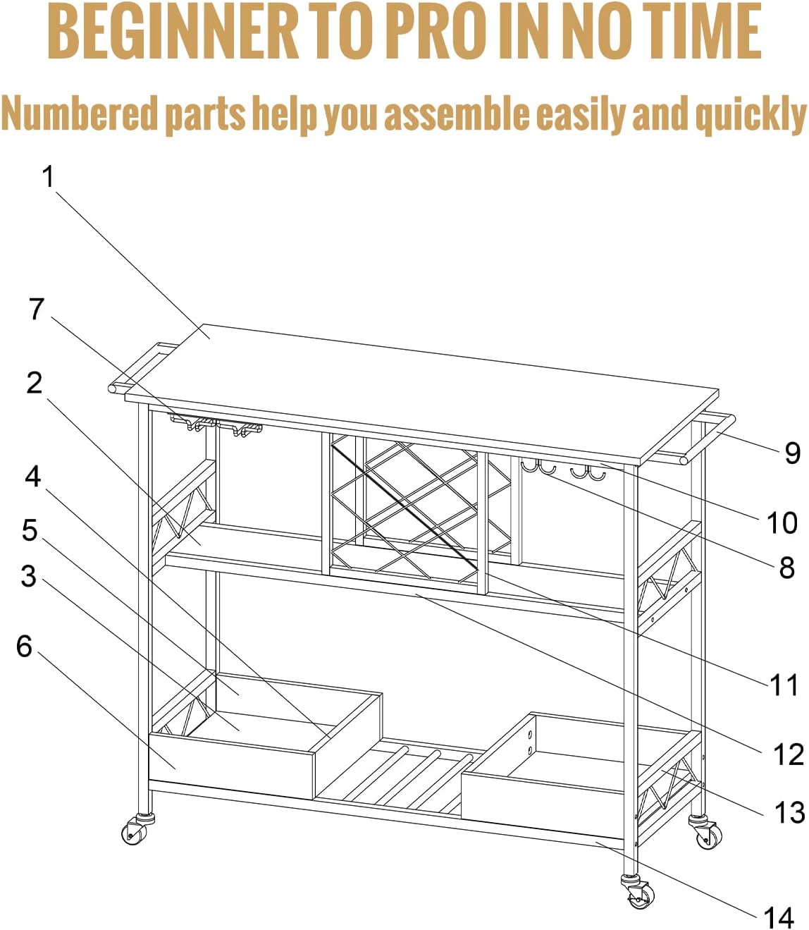 - Carefree Assembly: The liquor cart provides all necessary accessories and detailed instructions. It comes with unified screws and clear and brief instructions. All parts are provided with labeled numbers, and each assembly step is listed clearly. You can easily understand the assembly process, wasting little time and energy. Start preparing your favorite wines and dishes!