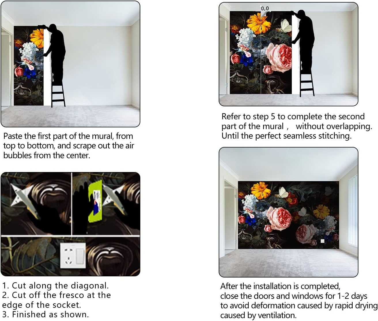- It's easy to install: at the bottom of each mural we have a numbered sequence, You can refer to the instructions we provided and the main picture 6-7,just match the numbers and you'll be amazed!